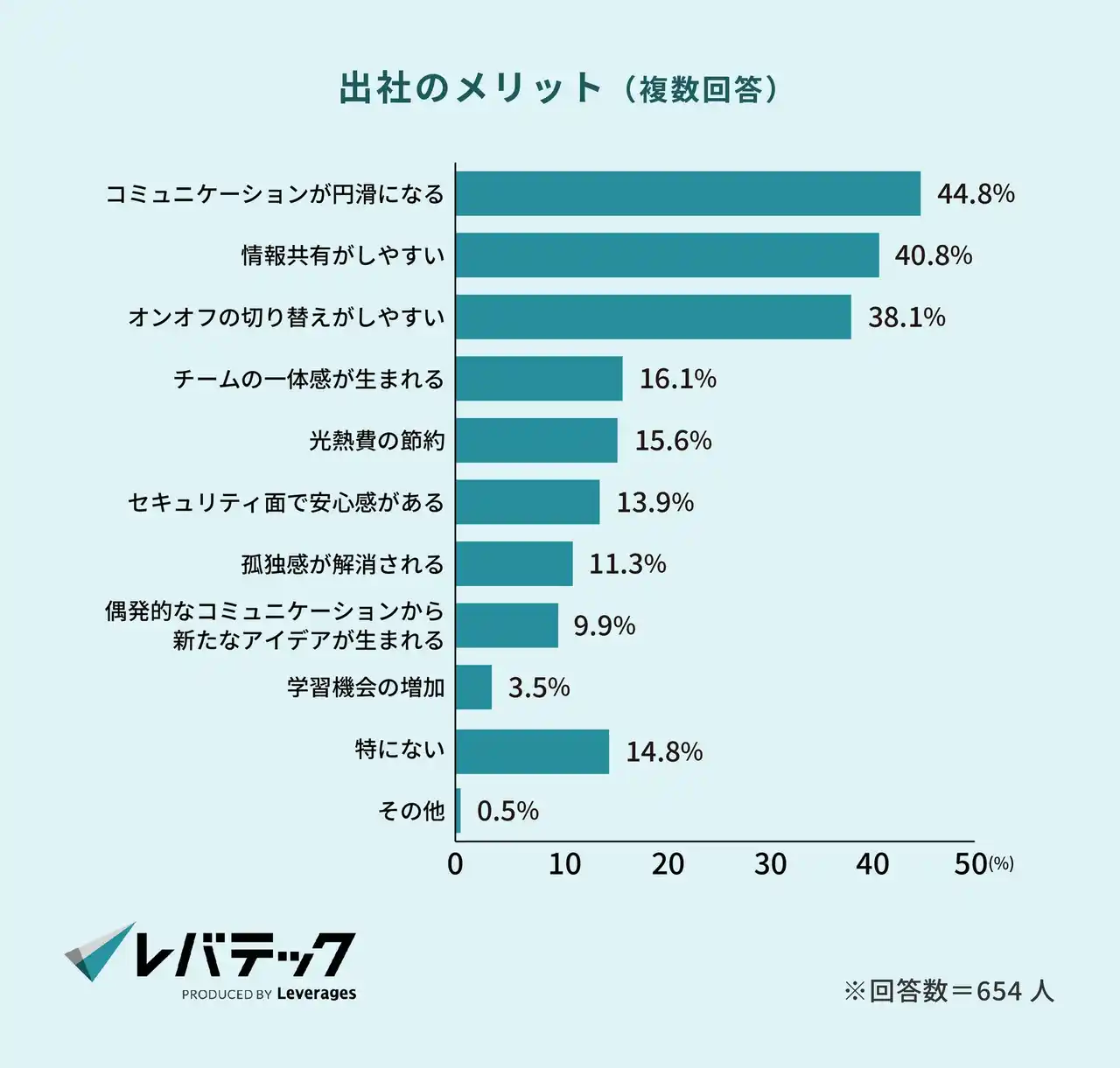 ITエンジニアが考える出社のメリットについては、「コミュニケーションが円滑になる(44.8%)」や「情報共有がしやすい(40.8%)」が上位に挙がりました。 |