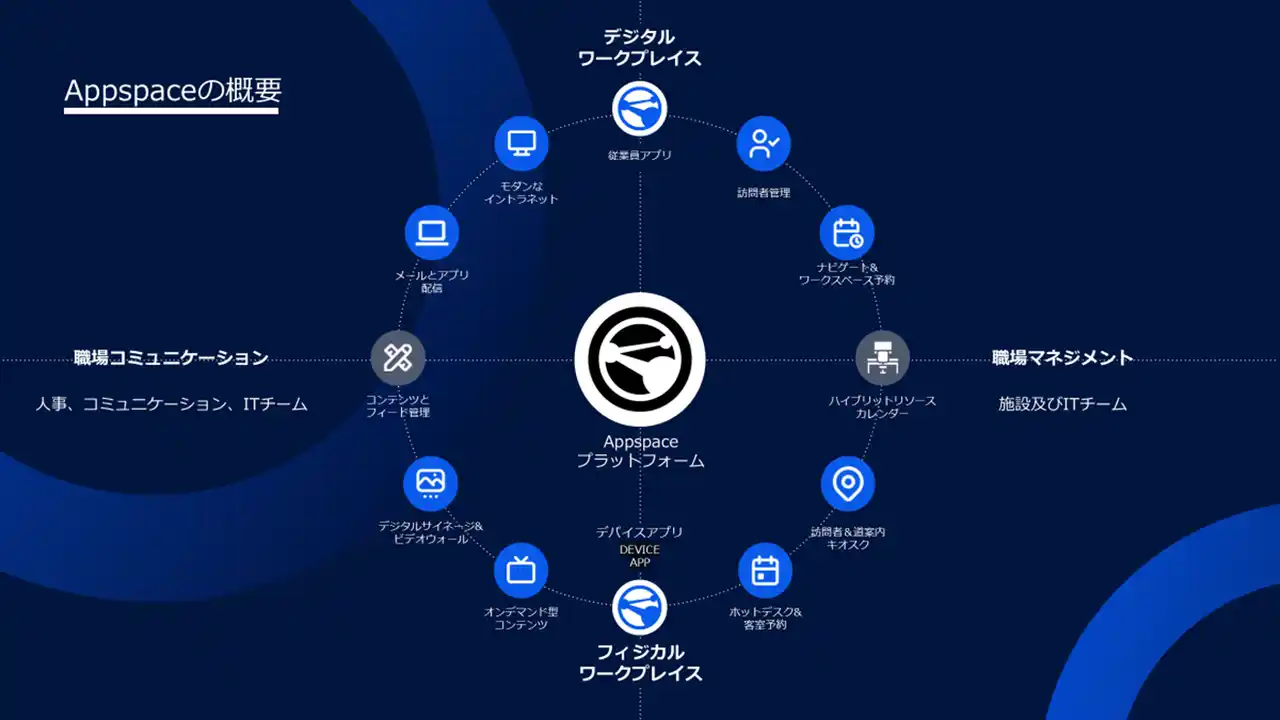 Appspaceは、従業員とのコミュニケーションから物理的なオフィススペースまで、すべてを管理できるチーム全体のためのワークプレイスエクスペリエンスプラットフォームです。デジタルサイネージ、スペース予約システム、フロアガイド等さまざまなソリューションが統合されたシステムです。詳細は http://www.appspace.com をご覧ください。 |