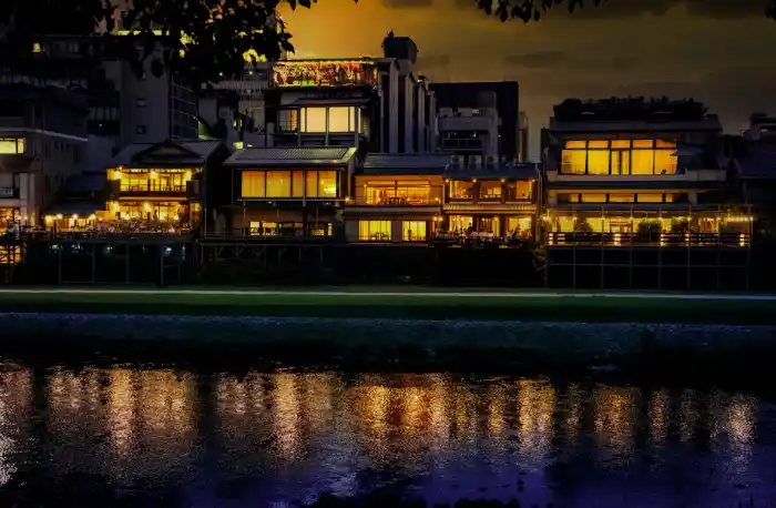 三条大橋からほど近くの鴨川沿いに佇む京都三条 箔。 |
