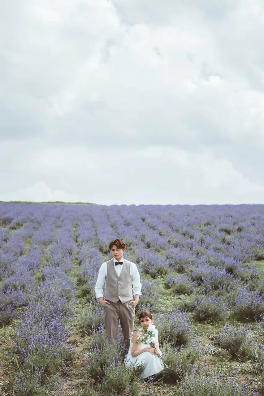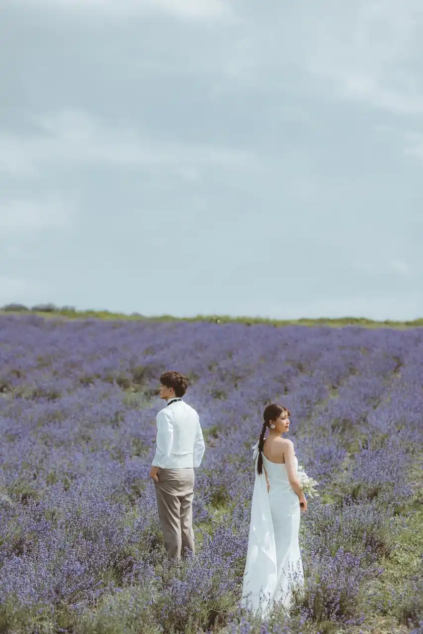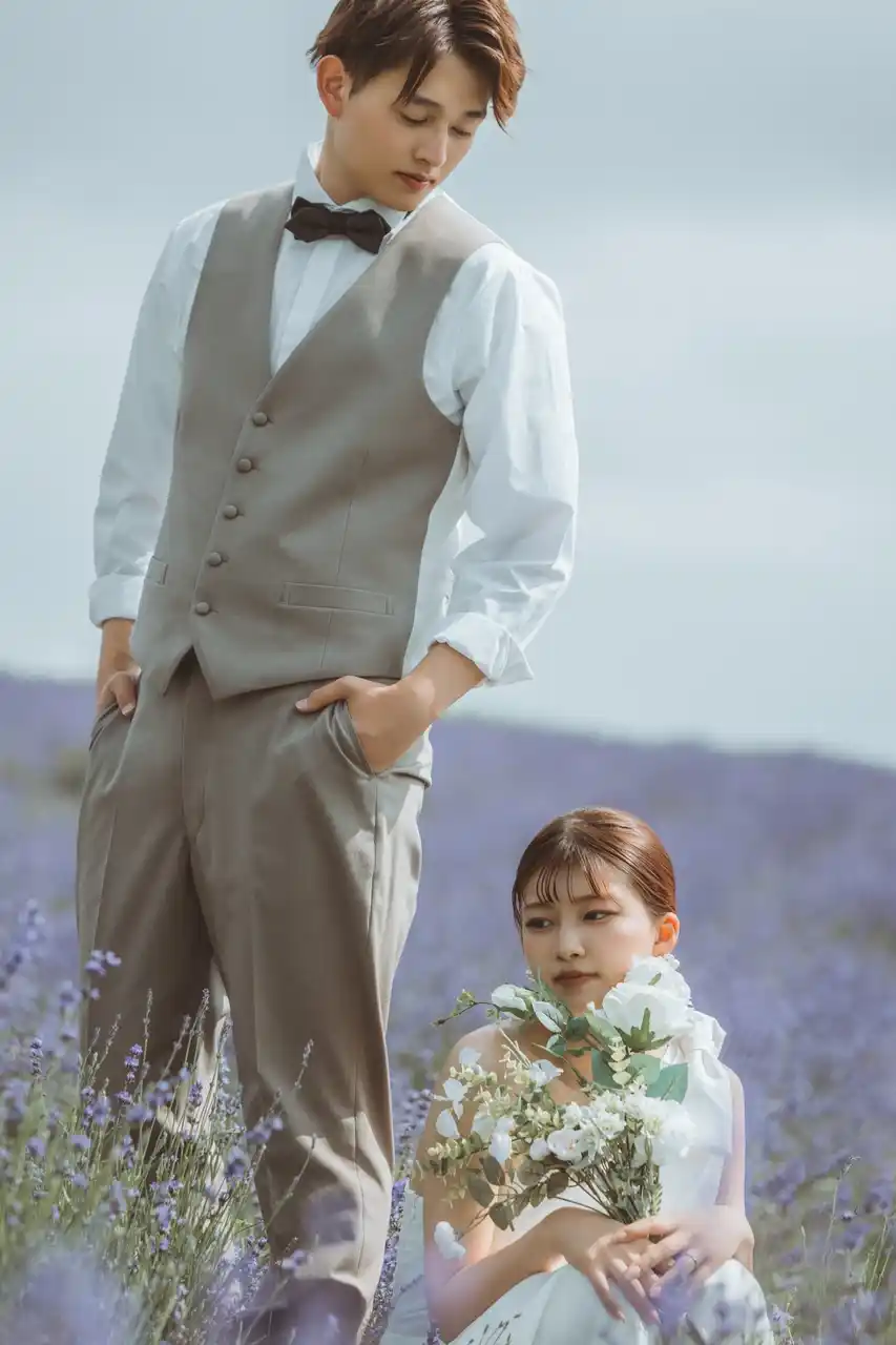 タイトにまとめたスタイルで洗練されたドレススタイルと絶妙に調和しており、全体の雰囲気に柔らかく優雅な印象を添えています。ナチュラルな美しさを引き立てつつ、ラベンダー畑のロマンチックな景色とも見事にマッチしていて、まるで映画のワンシーンのような演出に。 |