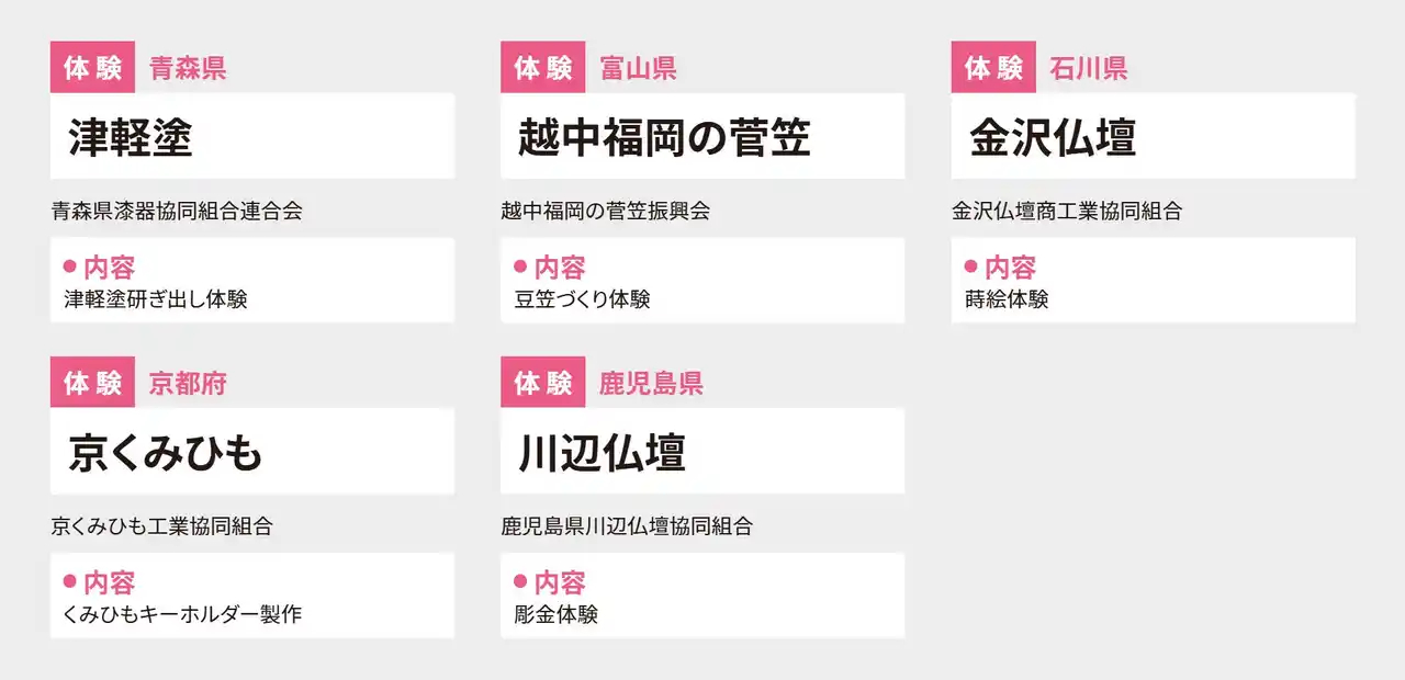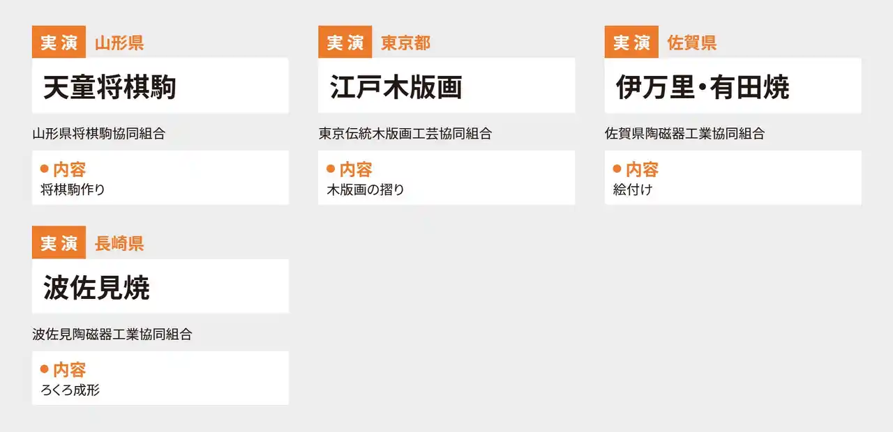 | 日本で代々受け継がれてきた伝統的工芸品の魅力を感じていただけるよう、多様な工芸品の展示、製作実演、製作体験などを実施します。普段は工房でしか見ることのできない製作工程や職人との交流を通して、伝統の技と心に触れる機会をご提供します。 | |||||||