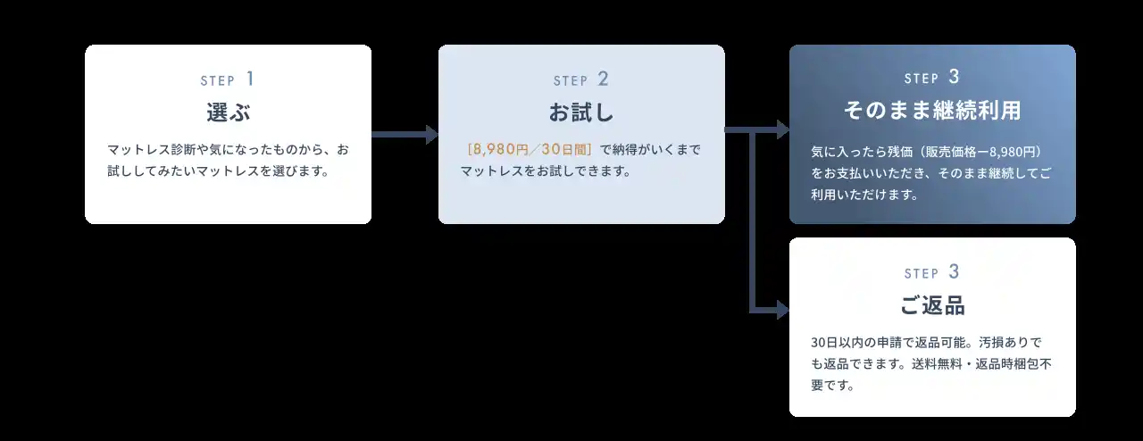 30日間8,980円で、納得がいくまでマットレスをお試しできます。 |