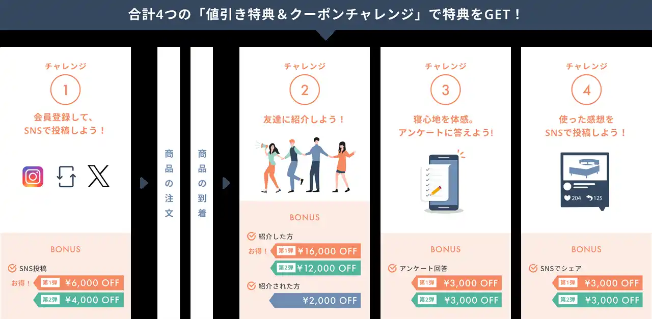 チャレンジ3. 寝心地を体感。アンケートに回答(3,000円OFF) |