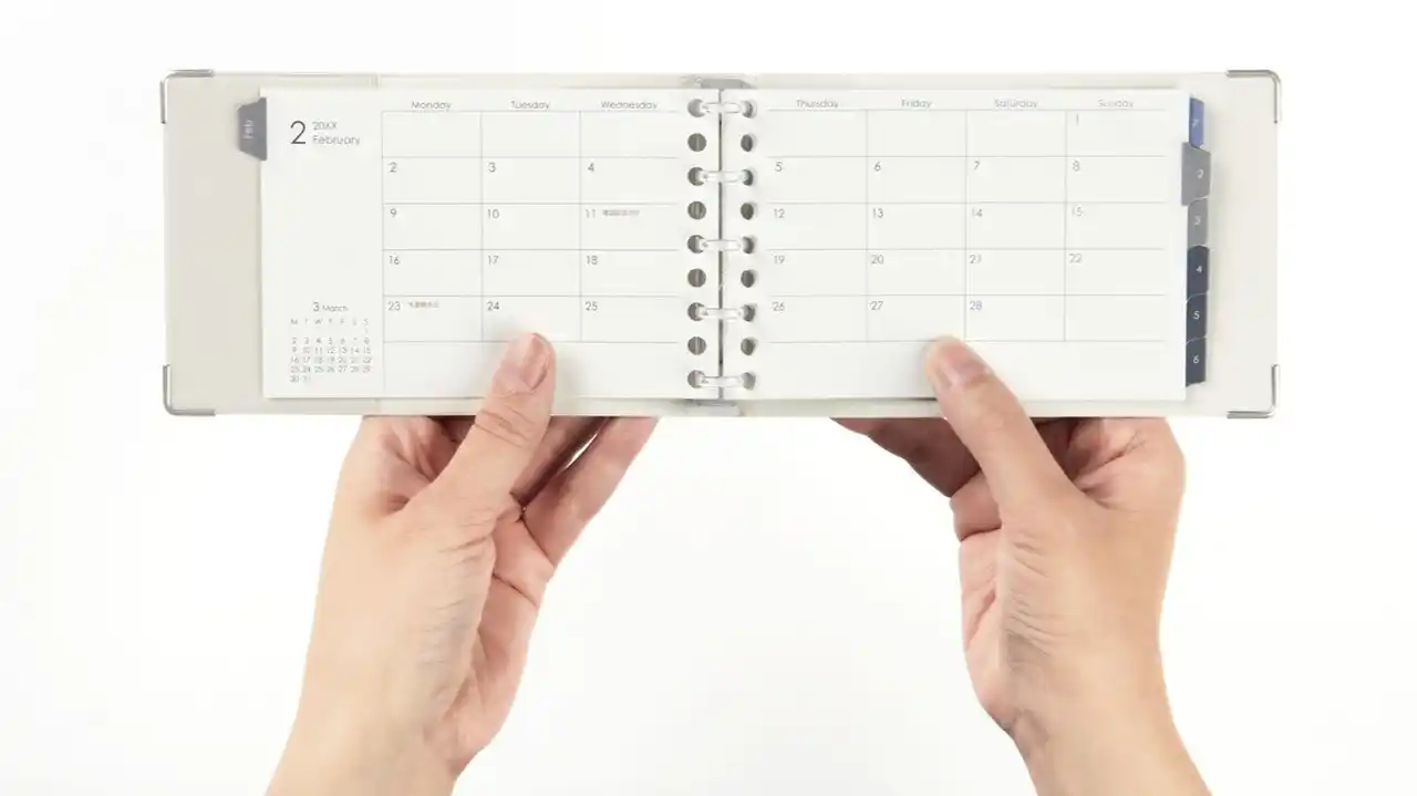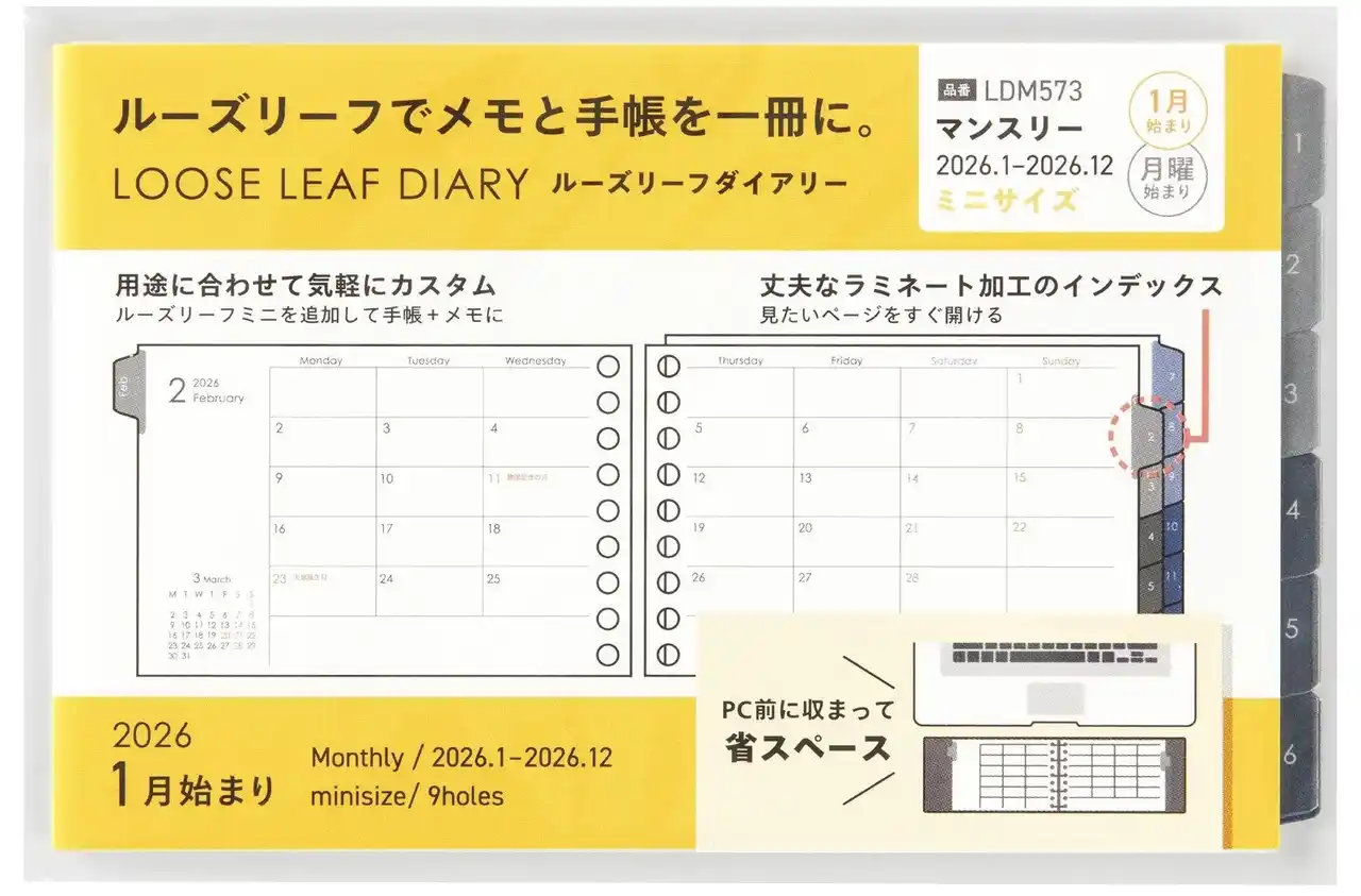 スケジュールも、タスクやログも、手軽にまとめて持ち歩き!ミニサイズのルーズリーフダイアリーが登場。見たいページがパッと開ける丈夫なラミネート加工のインデックスやイヤープランナー、メモページが付属。 |