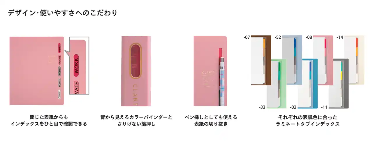 フランス語で透明・明瞭・明確”の意味を持つ『CLARTE (クラルテ) 』は、表紙に抜き加工が施されており、表紙を閉じてもインデックスのタイトルが一目で確認できる仕様です。また、インデックスの色は表紙のカラーに合わせてコーディネートされておりファッション性の高いバインダーです。 |