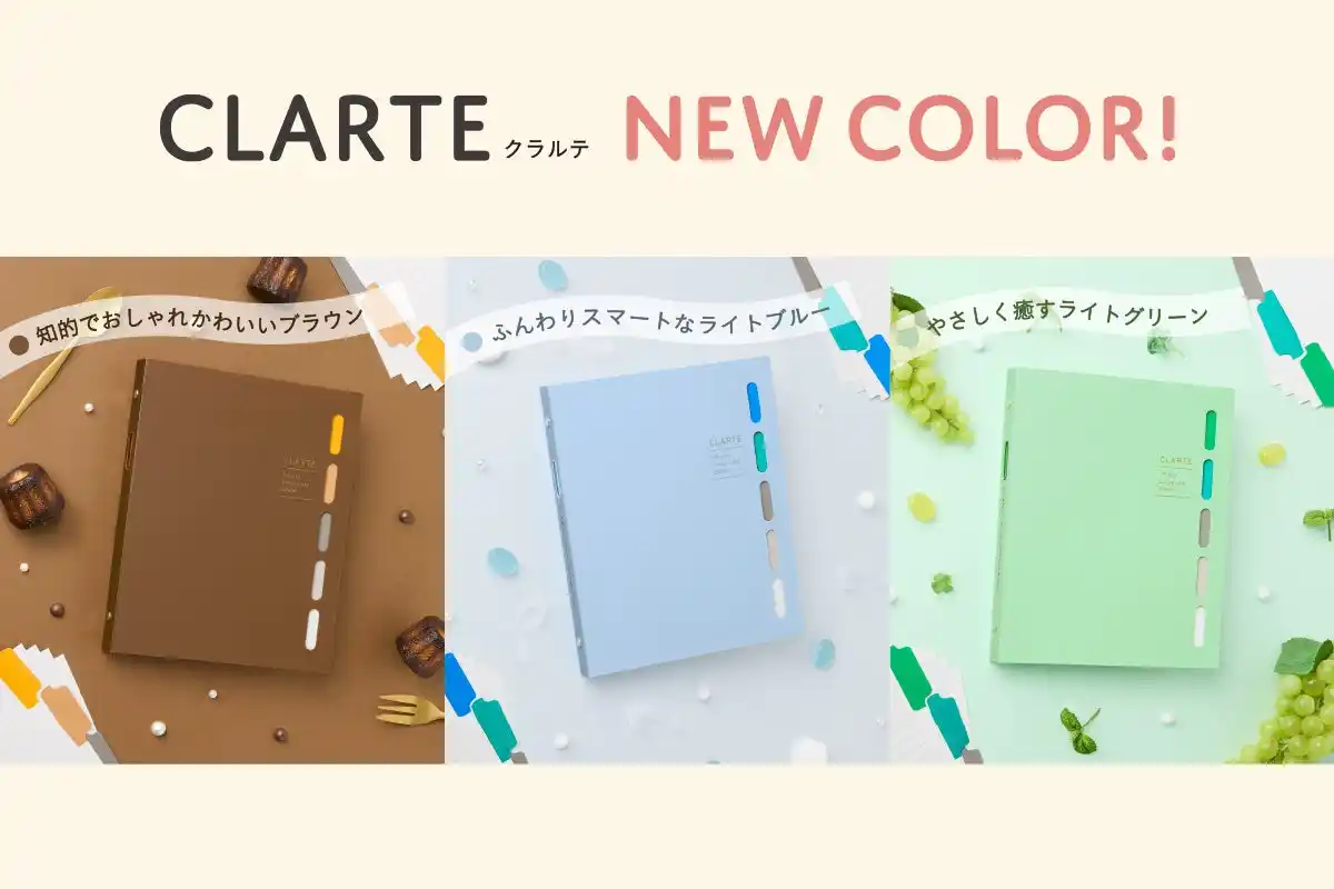 2016年の発売開始以来、学生・ビジネスシーンなどの幅広い層で人気のバインダーシリーズ『CLARTE(クラルテ)』に、知的でおしゃれかわいいブラウン、ふんわりスマートなライトブルー、やさしく癒すライトグリーンの3色が新登場。日常に溶け込む全7色カラー展開に落ち着いた印象のマットな手触り、さらに背表紙には高級感のある箔押しが施されています。 |