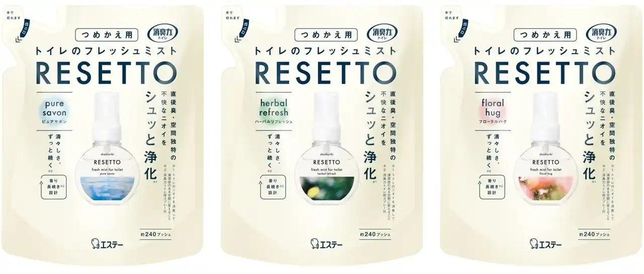 エステー株式会社(以下、エステー)は、トイレの気になるニオイをシュッと消し、一瞬で浄化(※1)されたようなフレッシュな空間に変えるミストタイプの消臭剤「消臭力 トイレのフレッシュミスト RESETTO(リセット)」と、その「つめかえ」を9月26日から全国のスーパー、ドラッグストア、ホームセンター、ネットショップなどで新発売します。 |