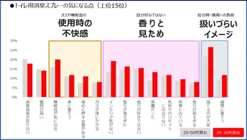 (※5)DS:エステー調べ n=262(日用品自購入者且つ男女20-50代トイレスプレー現使用者にスプレーで気になる点を確認、複数回答) |
