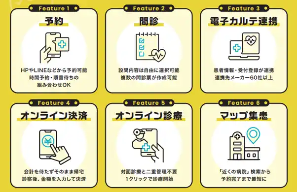 60 社以上の電子カルテ・レセコンとの連携により、患者情報や受付登録を自動反映 |