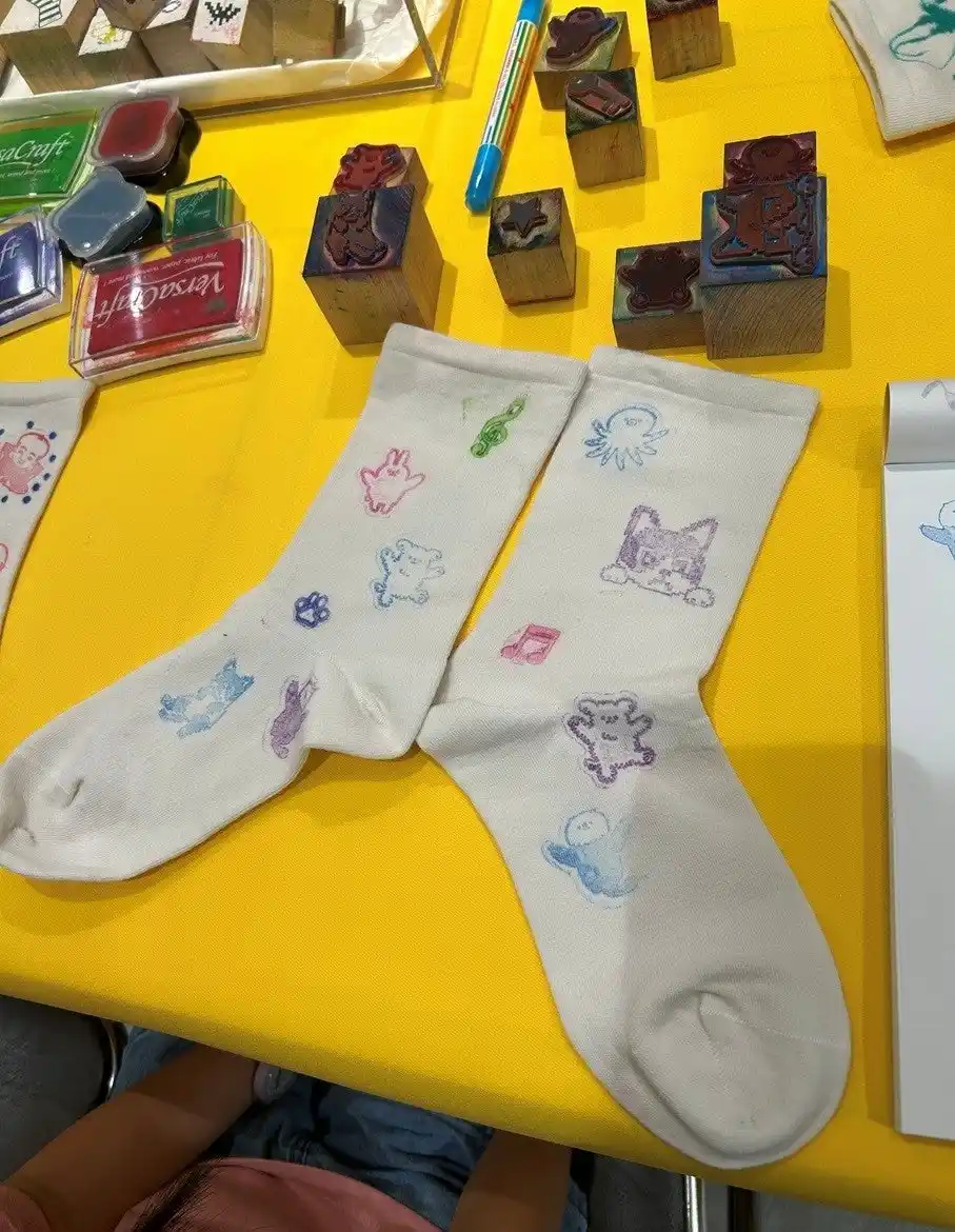 | 当社は、小学校低学年のお子さま向けに「靴下デザイナー」のお仕事体験を実施しました。無地の靴下に、福助オリジナルデザインの布用スタンプやペンを用いて自由にデザインし、さらに、当社直営店で使用している布製のギフト袋に入れてギフトラッピングを体験、ご自身がデザインした靴下を大切な人にプレゼントできるという内容で、6名のお子さまに参加いただきました。このお仕事体験を通し、将来を考えるきっかけづくりになればと思っております。 | |||