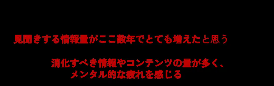 QOで実施した検証調査(*2)でも、「見聞きする情報量がここ数年でとても増えたと思う」への共感度は72.6%、「消化すべき情報やコンテンツの量が多く、メンタル的な疲れを感じることがある」への共感度は57.3%と、動向を裏付けられる結果となりました。 |