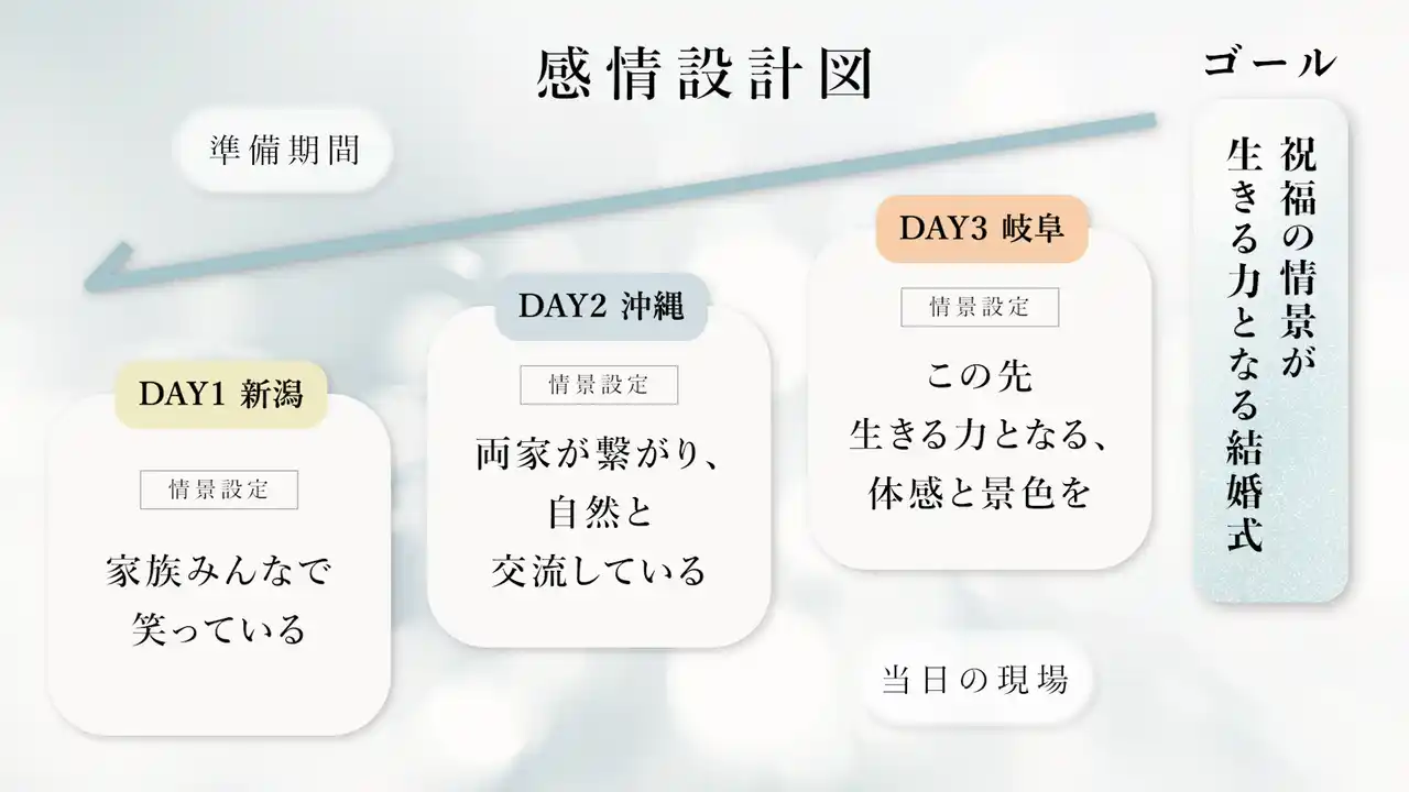 タイトル:「ルーツを辿る結婚式」3DAYSの伴走記 今回受賞した結婚式プランは、「結婚式は一日で行うもの」という一般的な概念を手放し、3回に分けることで人生の節目を丁寧に刻んでいくという大胆なアプローチ。 「新郎新婦にとって結婚式をする意味は何か?」「結婚式を通してどう在りたいのか?」という本質的な問いかけを行い、新郎新婦や家族との対話を通して、“見えにくかった想い”や“未解決の感情”を紐解いていきます。そのプロセスを経て、3つの意味ある時間が設計されました。 |