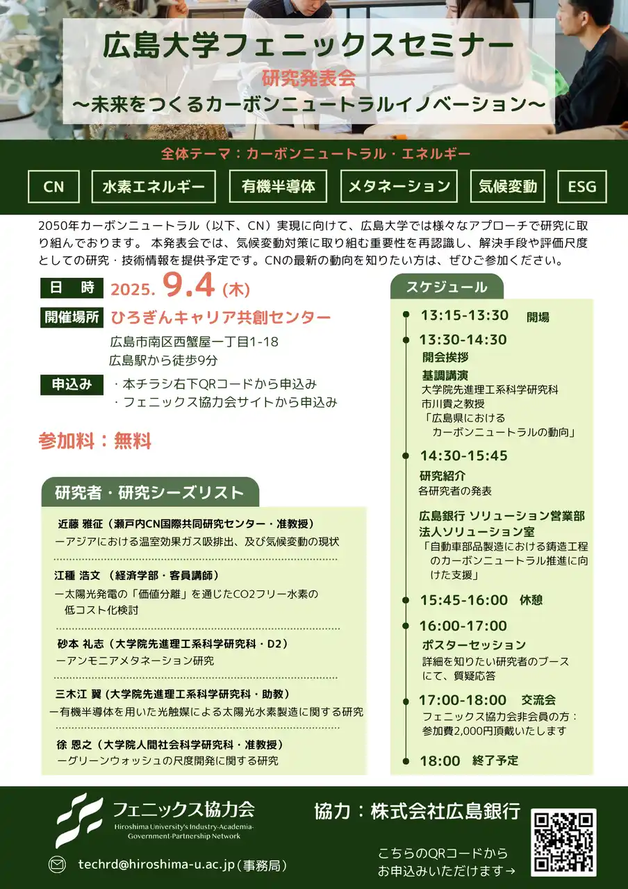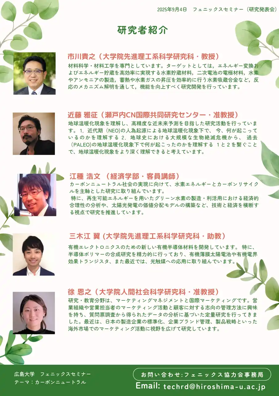2050年カーボンニュートラル(以下、CN)実現に向けて、広島大学では様々なアプローチで研究に取り組んでおります。 本研究発表会では、気候変動対策に取り組む重要性を再認識し、解決手段や評価尺度としての研究・技術情報を提供予定です。CNの最新の動向を知りたい方は、ぜひご参加ください。 |