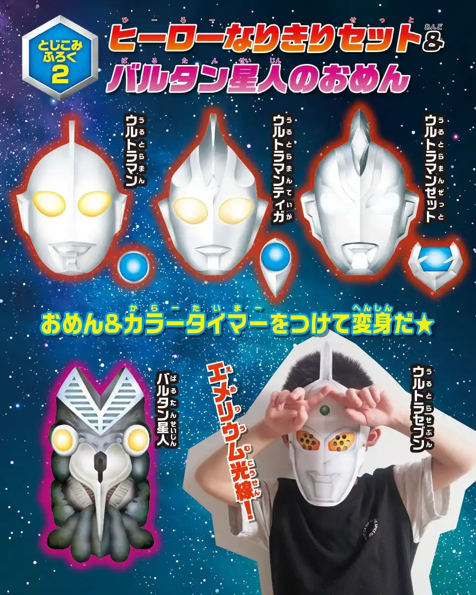 初代ウルトラマン、ウルトラセブン、ウルトラマンティガ、ウルトラマンゼットのおめんとカラータイマーを身につけて、ヒーローに変身! 必殺技やポーズを真似して楽しめます。 |