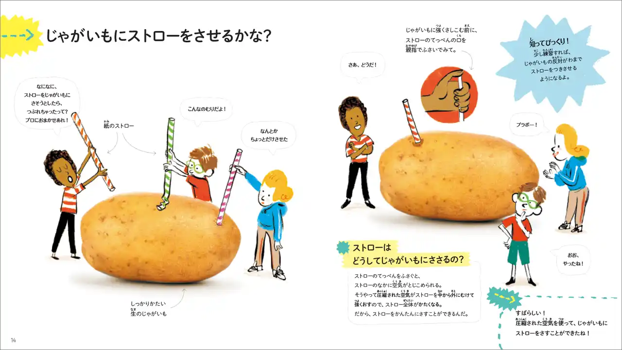 ・じゃがいもを使って、浸透圧の原理や重心についてまで学べるとは、この本を読むまで気付かなかった。マッシュポテトや、ポテトチップスもでんぷんの働きや、メイラード反応にまで考えを及ぶことは今までなかった。そして、秀逸なのはじゃがいもにストローを刺す実験。えええ!思いつきもしなかったよ!