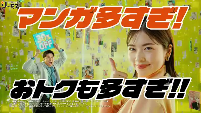 !?」と叫ぶ木村さん。さらに「ポイントも!?」と続き、「こんなもらえるの~!?」と驚きのリアクション。「これはもう…」と小芝さんがクーポンを持ちながら木村さんを煽ると、木村さんはついに「おトクが止まらなーい!」と本音を叫びます。ラストは、「マンガ多すぎ!おトクも多すぎ!!」というナレーションとともに、木村さんを引き込むことに成功してドヤ顔を浮かべる小芝さん。そして現実世界に戻った3人が、そろって「コミックシーモア」と声を合わせ、シーンを締めくくります。 |