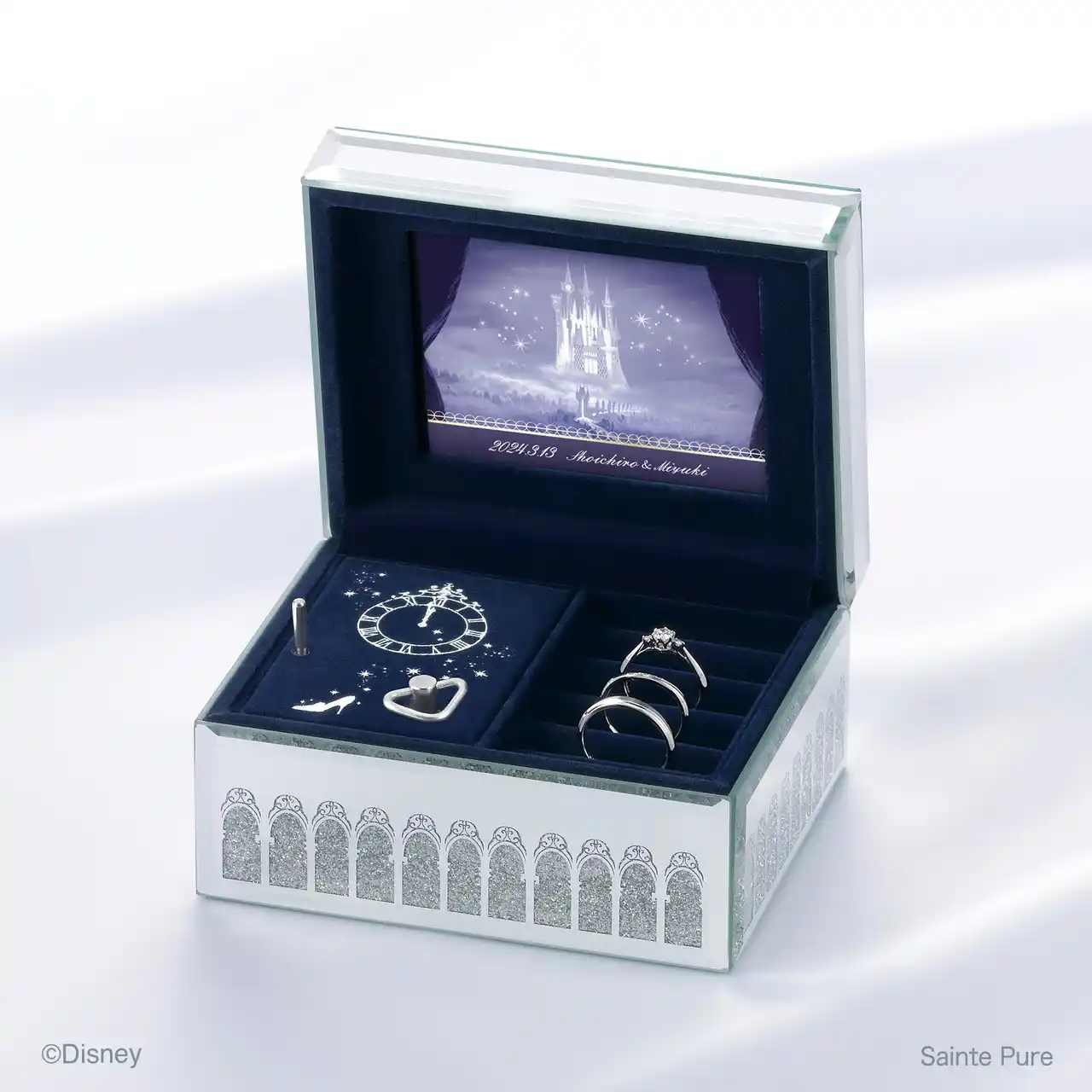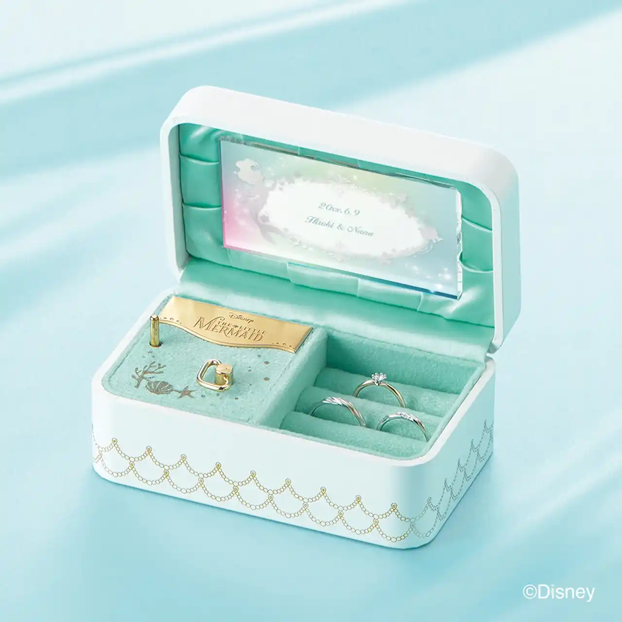 婚約指輪、結婚指輪をセットでご成約した方へ ホワイトを基調とした可愛らしいオルゴールボックスが奏でるのは、作中でアリエルが歌う名曲「パート・オブ・ユア・ワールド」。 お二人の名前や記念日を印字いただけます。  |