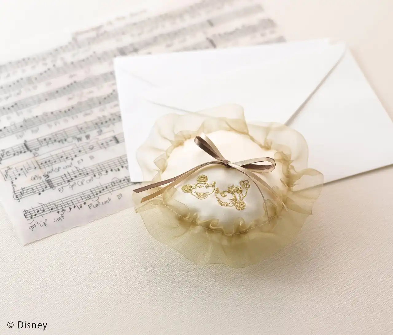 婚約指輪または結婚指輪をご成約した方へ 満面の笑みを浮かべるミッキーとミニーの刺繍がポイントのリングピロー。  |