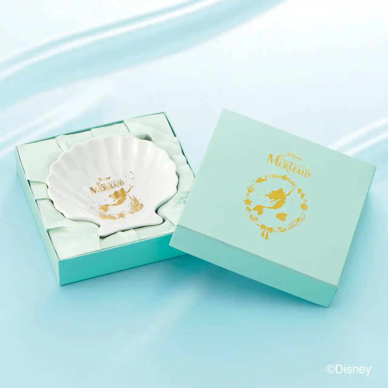 婚約指輪または結婚指輪をご成約した方へ 貝殻を模した陶器のトレイには優雅に海を泳ぐアリエルが豪華な箔押しで表現されています。  |