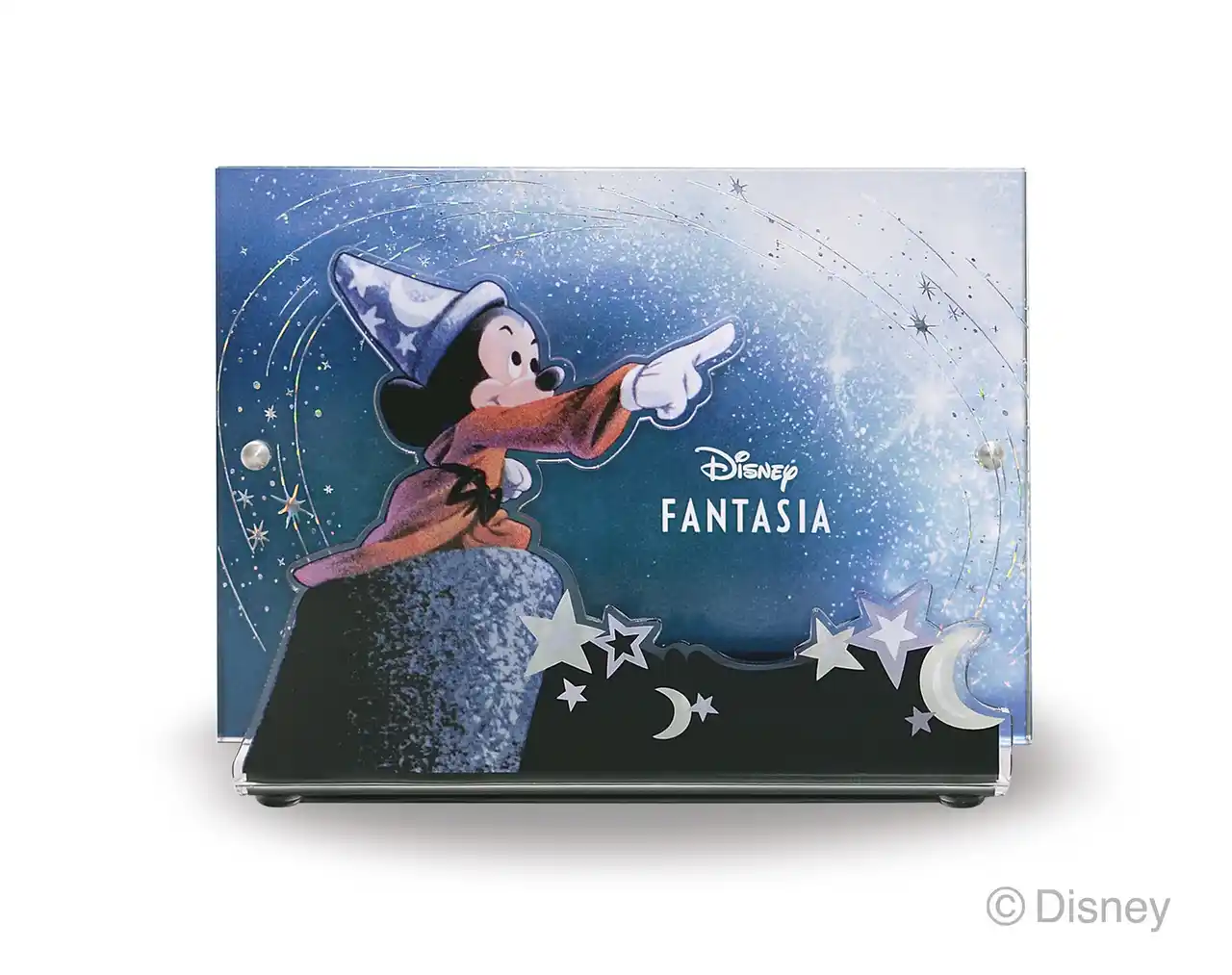 婚約指輪、結婚指輪をセットでご成約した方へ 『ファンタジア』の幻想的な世界をイメージしたフォトスタンドです。 中紙をはずしてL版写真に入れ替えることが可能で、ふたりの思い出の瞬間にミッキーが魔法をかけているように見えます。  |