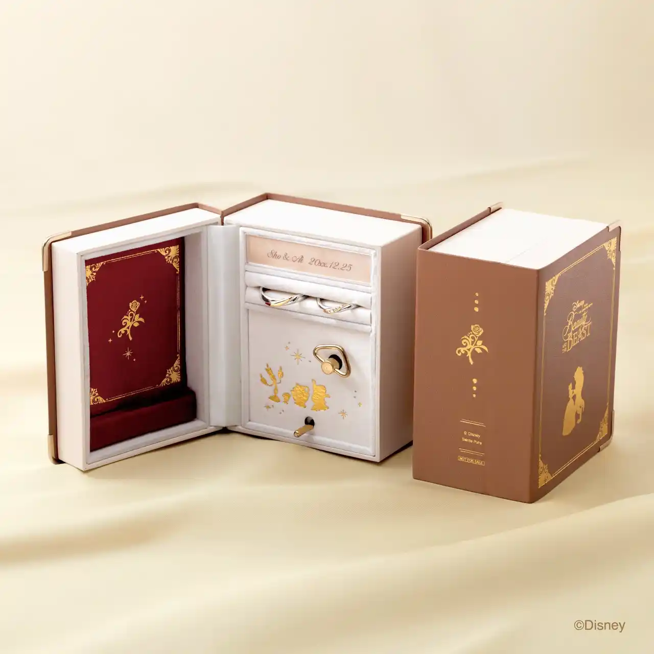 婚約指輪または結婚指輪をご成約した方へ ディズニーアニメーション映画『美女と野獣』のテーマ曲「Beauty and the Beast」を奏でるオルゴールは、読書が大好きなベルを想わせるブック型。 お二人の名前や記念日を印字いただけます。  |