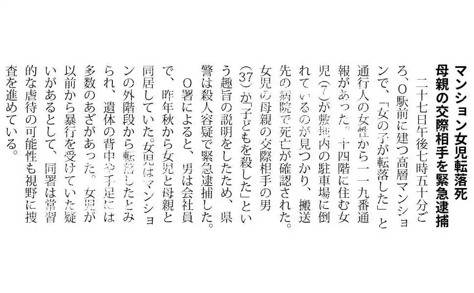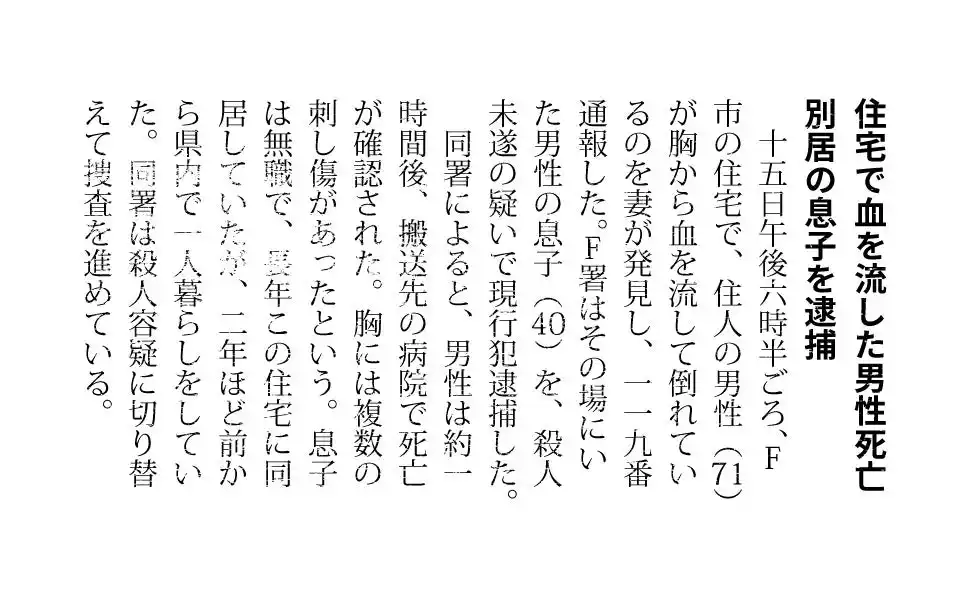 ■高齢夫婦が熱中症で死亡か エアコンつけず 新聞の片隅にしか載らない、小さな5つの事件。 その裏には、報道されない真相がある――。 |