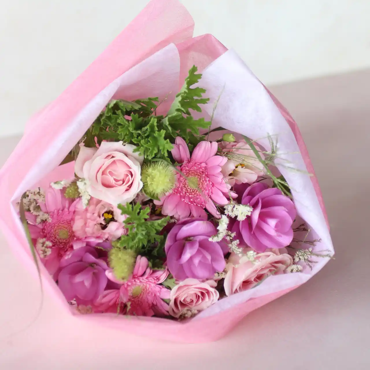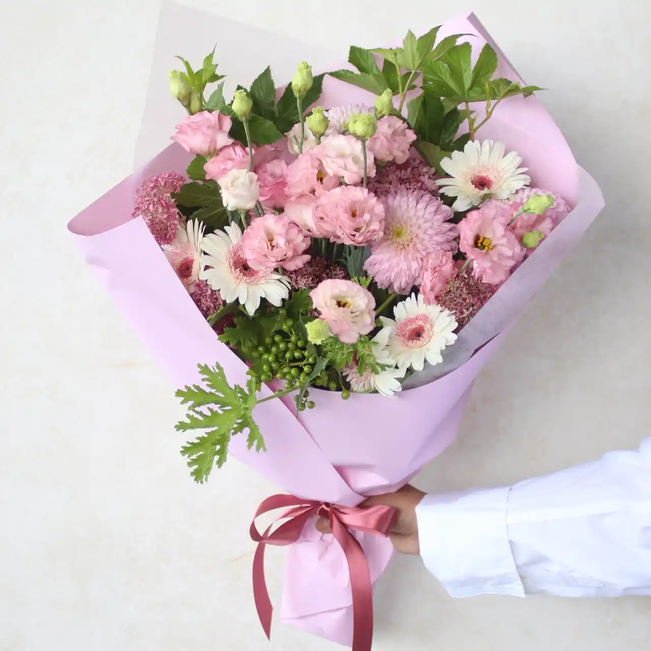 かわいらしいものが好きな人へは、ピンクの花々を集めたブーケがおすすめです。飾りやすいサイズにまとめたなかにも、季節の花をふんだんに盛り込むことで、もらった瞬間の幸福感をたっぷりと味わっていただけます。 |