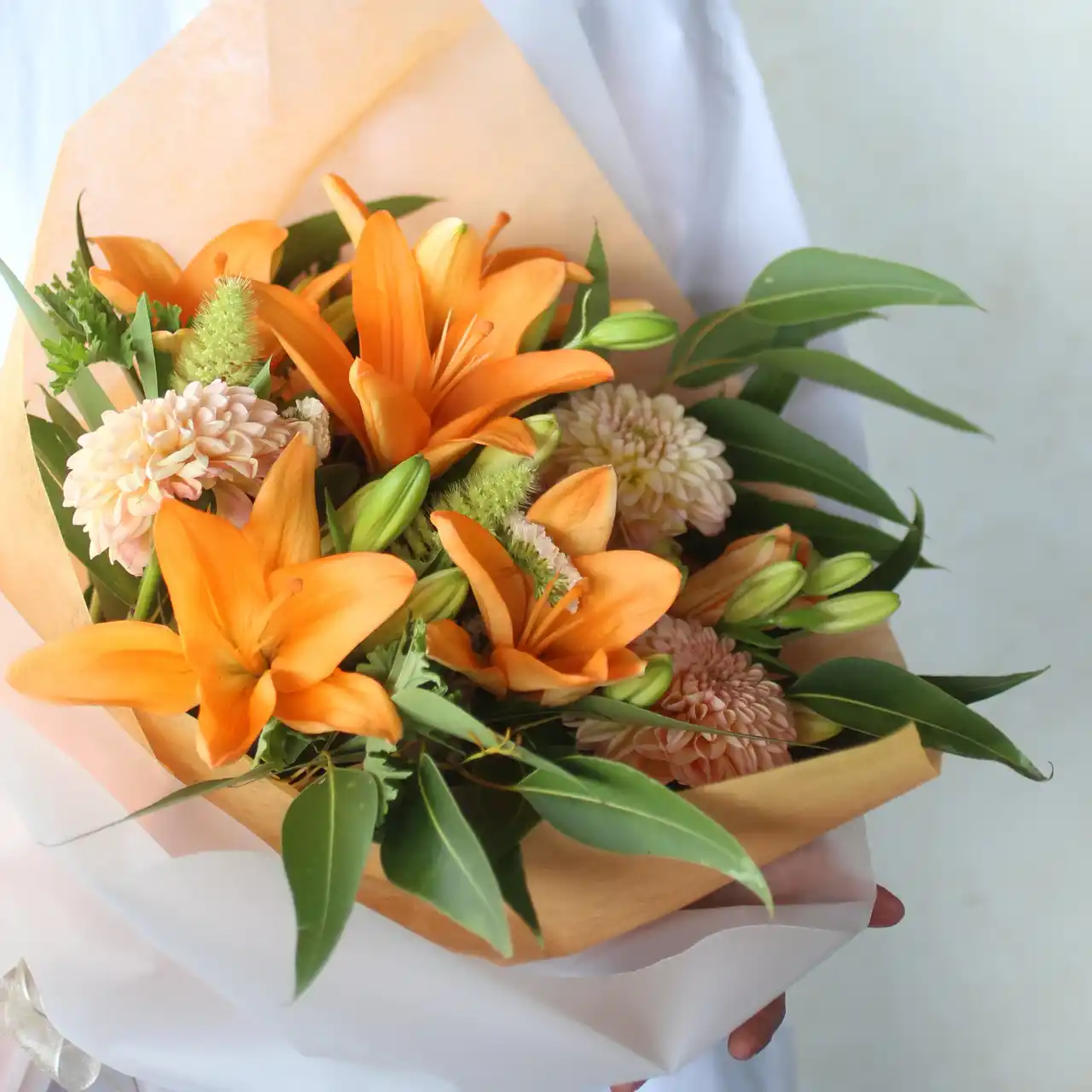 「誕生日ブーケ_バースデーフラワー」は、誕生月に旬を迎える花をメインにした、ゴージャスな花束。その月のイメージの色でまとめます。真夏の8月生まれの人には、はつらつカラーのオレンジ色でまとめた、ユリを主役にした華やかな花束をご用意しました。 |
