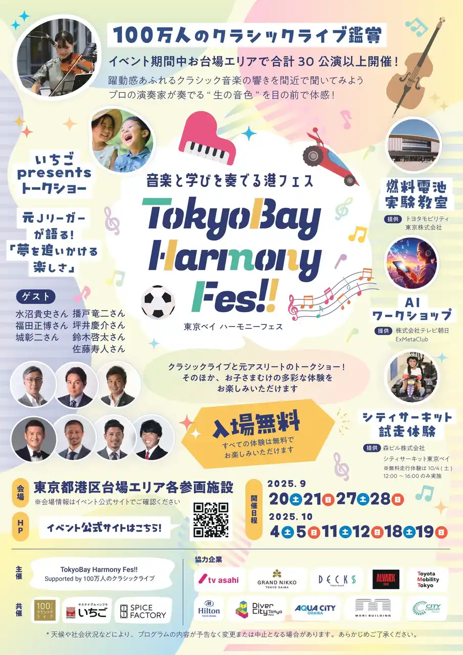 | 秋のお台場で毎週土日に5週連続開催。クラシックライブ、最新AI体験、元プロサッカー選手によるトークショーなど、多彩な学びと体験を提供 |