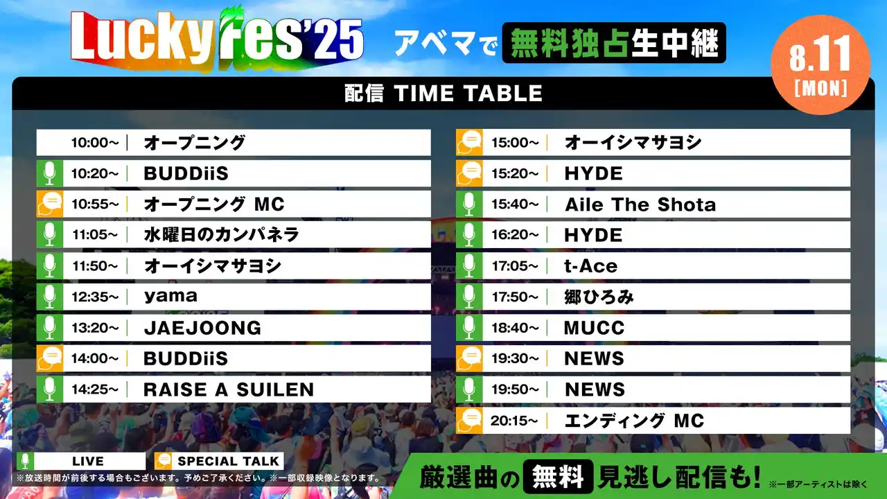 今回「ABEMA」では会場にいる方もそうでない方も、多くの方に場所を問わず『LuckyFes’25』を楽しんでいただけるよう、8月9日(土)・10日(日)・11日(月・祝)の3日間の開催のうち一部アーティストを除き、独自のタイムテーブルを組みRAINBOW STAGE、WING STAGE、GARDEN STAGEを配信いたします。さらにステージ配信の合間には、一部アーティストのトークもお届けします。 |