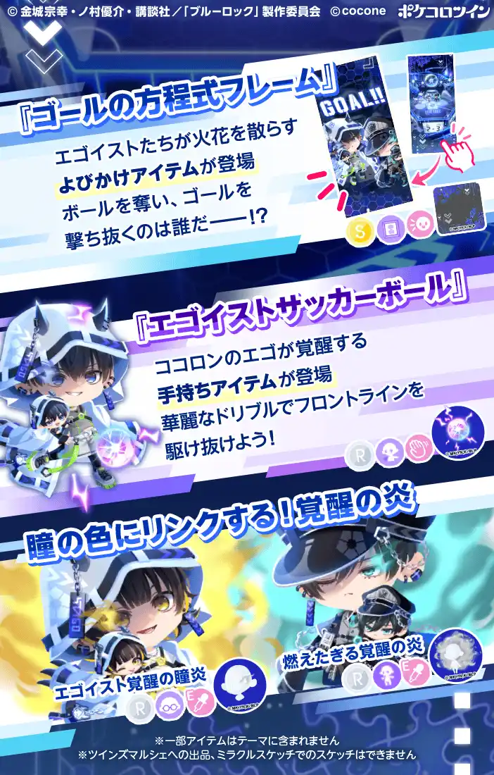 ここでしか手に入らないサイバーをテーマにした特別な衣装で、『ブルーロック』の人気キャラクターたちによる“ここだけのアツい試合”を『ポケコロツイン』でぜひご体験ください。 |