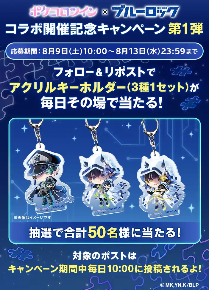 『ポケコロツイン』のアプリ内に設けられた専用フォームから応募すると、抽選で50名様に『ブルーロック』描き起こしイラストを使用したコラボ限定デザインのアクリルスタンドが当たるキャンペーンを開催します。 |
