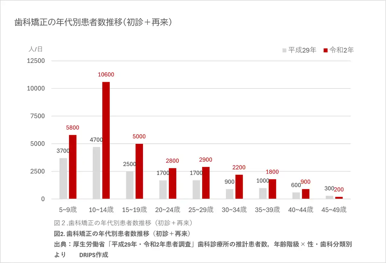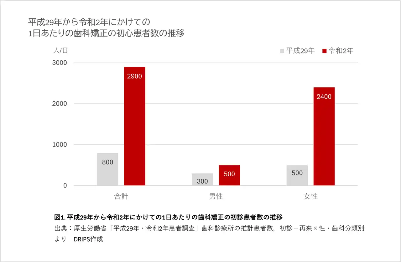 近年、大人の歯列矯正が需要の高まりをみせています。厚生労働省の調査によると過去3年間で歯科矯正初診患者数は3.6倍に増加し、特に女性は4.8倍と顕著に増加しています。増加数では10代が最も多く、次いで25~34歳の大人の増加率も高い傾向がみられます。背景にはオーラルの健康意識の高まり、美容目的、経済面での安定が考えられます。 また、2025年から義務化が目標とされている「国民皆歯科検診」の影響で需要喚起され、さらなるオーラルケア意識の高まりや、オーラルフレイル(口腔機能の衰え )や生活習慣病とも関わる全身健康として認知拡大することが将来の動向として考えられます。 |