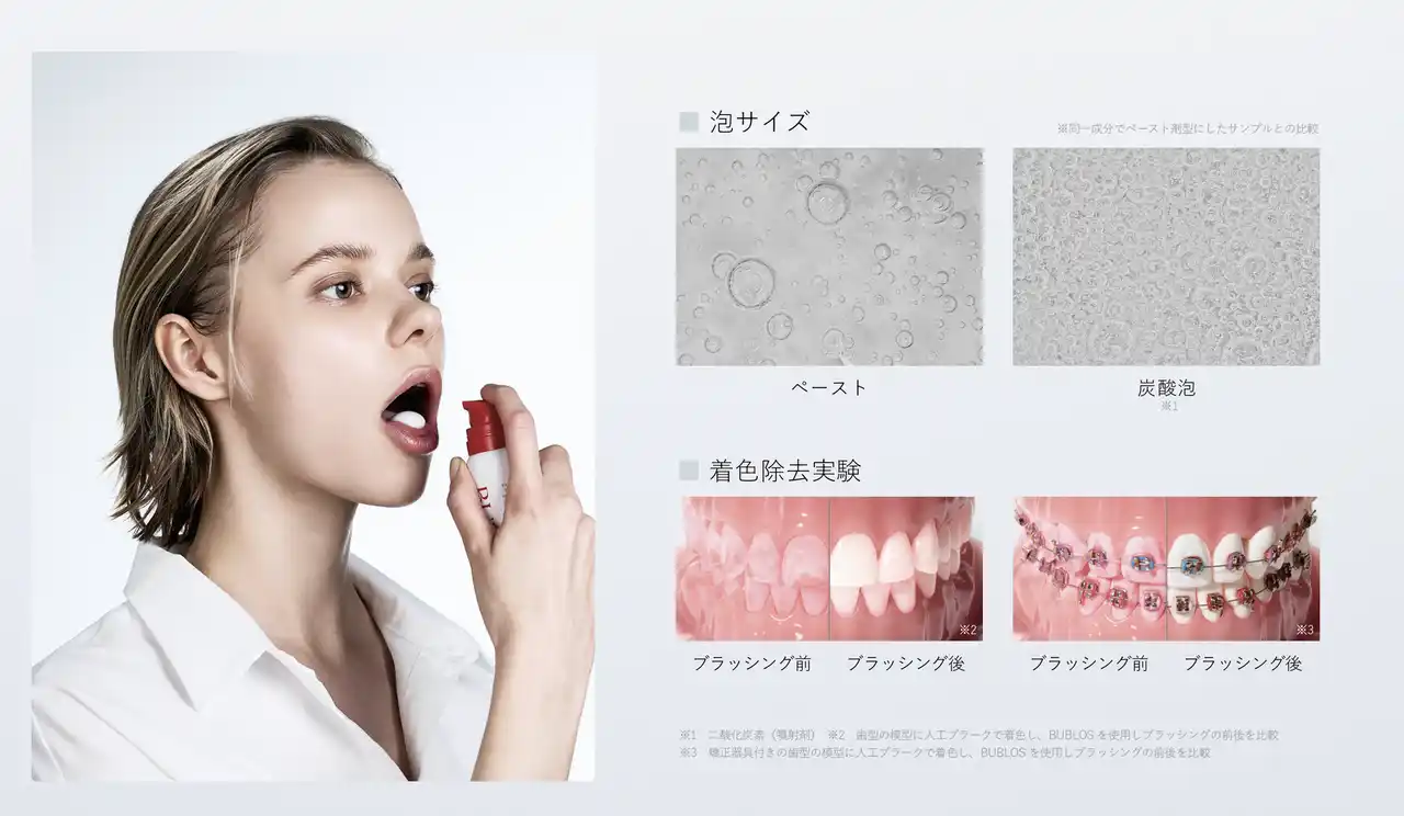 BUBLOSは、炭酸 *3泡が普段の磨きにくい歯間や歯周ポケットまで*4行きわたり、虫歯や口臭、歯周病をすみずみまでトータルケア。また、みがき残しが気になる歯列矯正中のオーラルケアにもおすすめです。 |