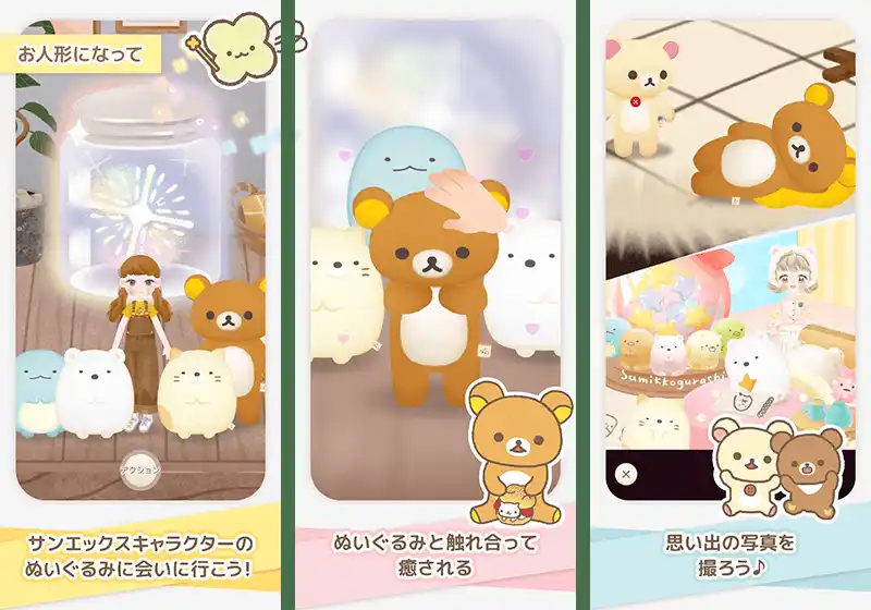 アプリには、リラックマやすみっコぐらしなど、サンエックスの人気キャラクターのぬいぐるみたちが登場します。お買い物を楽しみ、お人形とドールハウスを想い想いにコーディネートし、かわいいぬいぐるみとふれあう体験ができます。 |