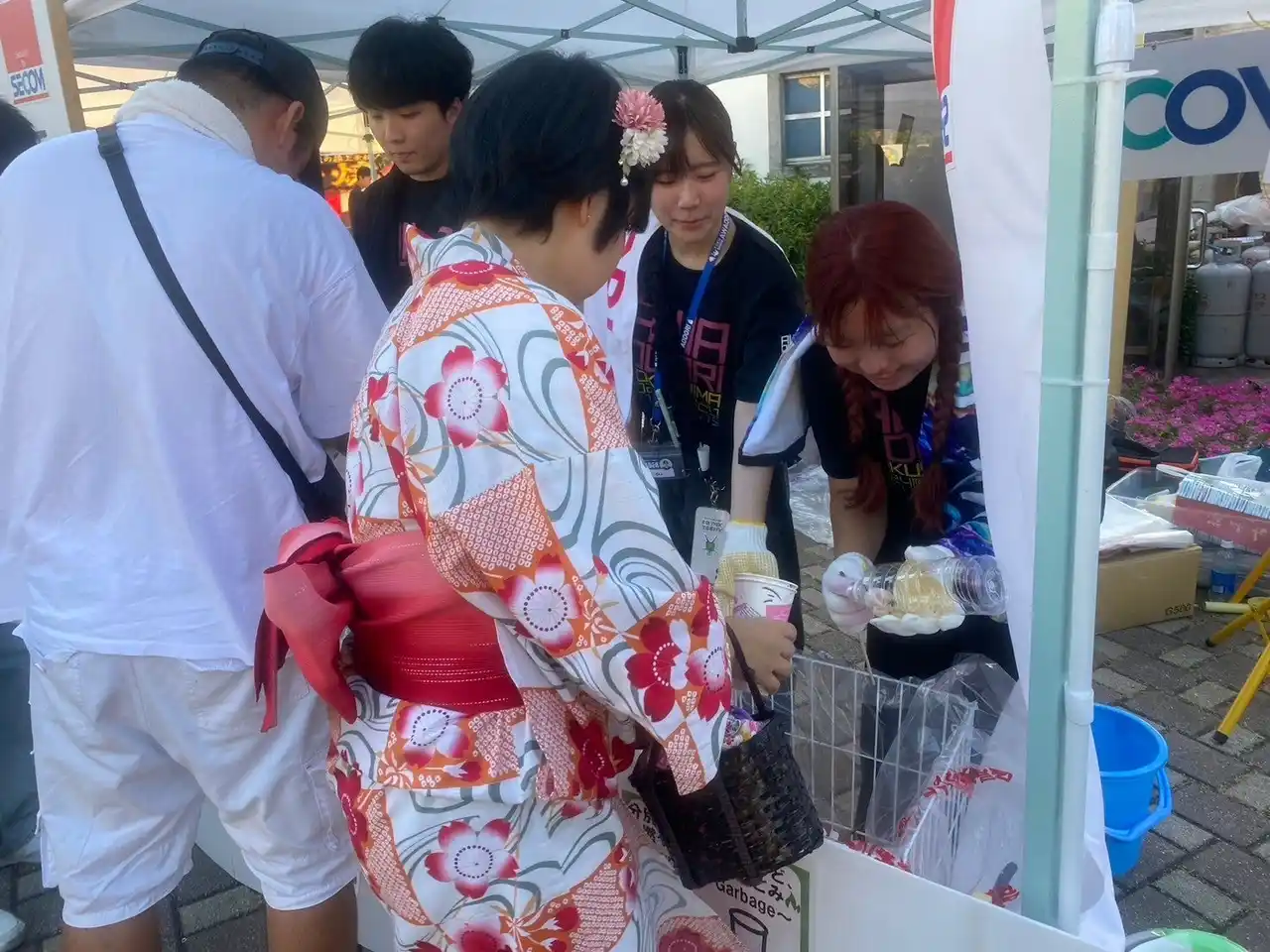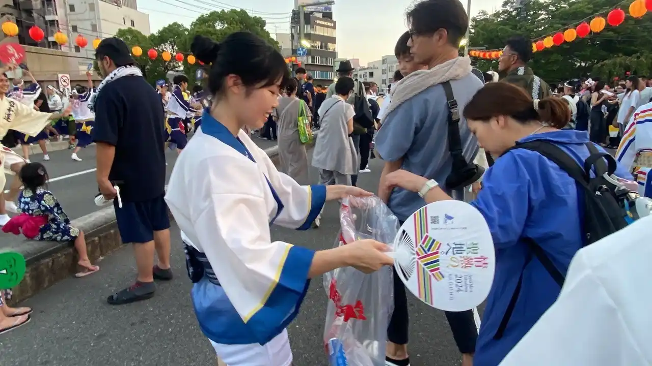 学生連有志とごみゼロ連が、観客からごみを回収しながら、両国本町演舞場の最終に踊り込みます。観客と共に演舞場を踊りきった後、踊り子・観客・地域の人たち・ボランティアスタッフが一緒になって、周辺のごみを拾い集め、演舞場やまちを、踊る前よりもきれいにすることを目指します。 |
