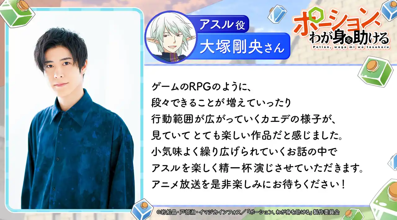 株式会社イマジカインフォス(本社:東京都 代表取締役社長:前田起也、以下イマジカインフォス)は、大日本印刷株式会社(本社:東京都 代表取締:北島義⻫、以下、DNP)との共同事業「AnimationID」の第5弾作品、ヒーロー文庫の大人気ファンタジー『ポーション、わが身を助ける』(著・岩船 晶 イラスト・戸部 淑)のメインキャストを本日発表いたしました。 |
