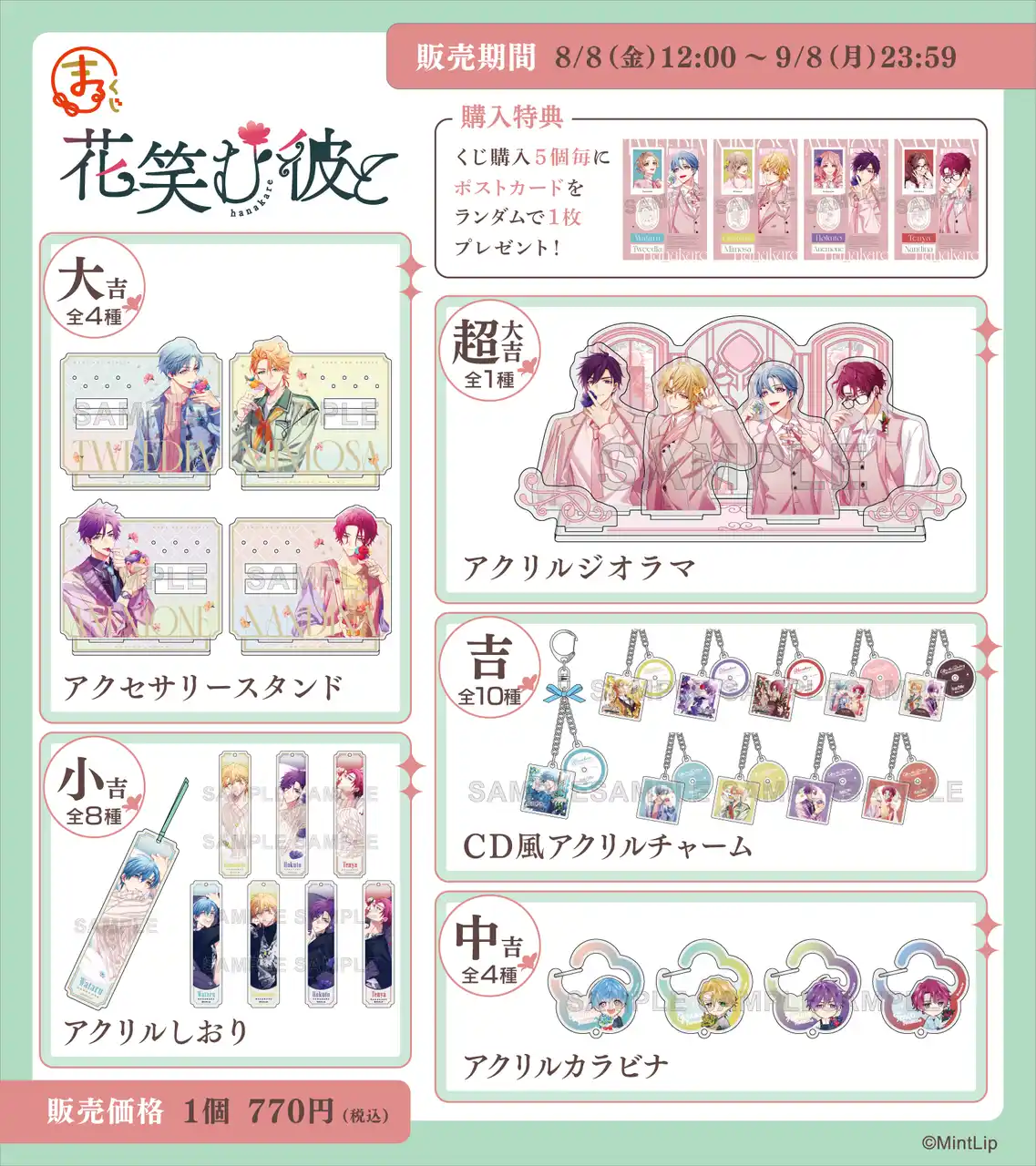 株式会社エディア(本社:東京都千代田区、代表取締役社長:賀島 義成)の子会社、株式会社ティームエンタテインメント(本社:東京都千代田区、代表取締役社長:賀島 義成 以下:ティームエンタテインメント)は、2025年8月8日(金) 12:00より『花笑む彼と』3rd Anniversaryの限定グッズを、インターネットで購入できる抽選くじサービス『まるくじ』にて販売開始したことをお知らせいたします。 |
