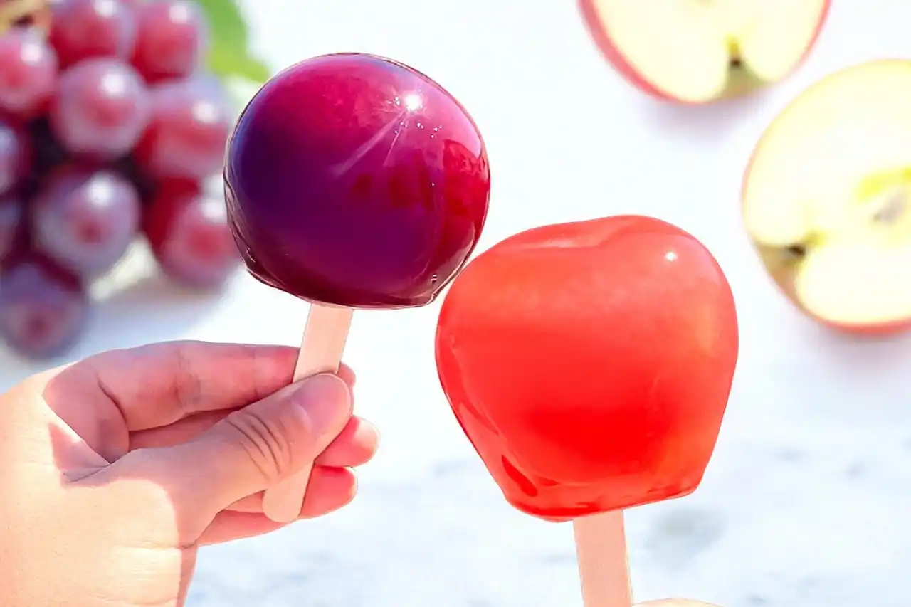 リンゴとブドウの形をまるごと再現した、まるでフルーツ飴のような見た目の「葛バー」。 |