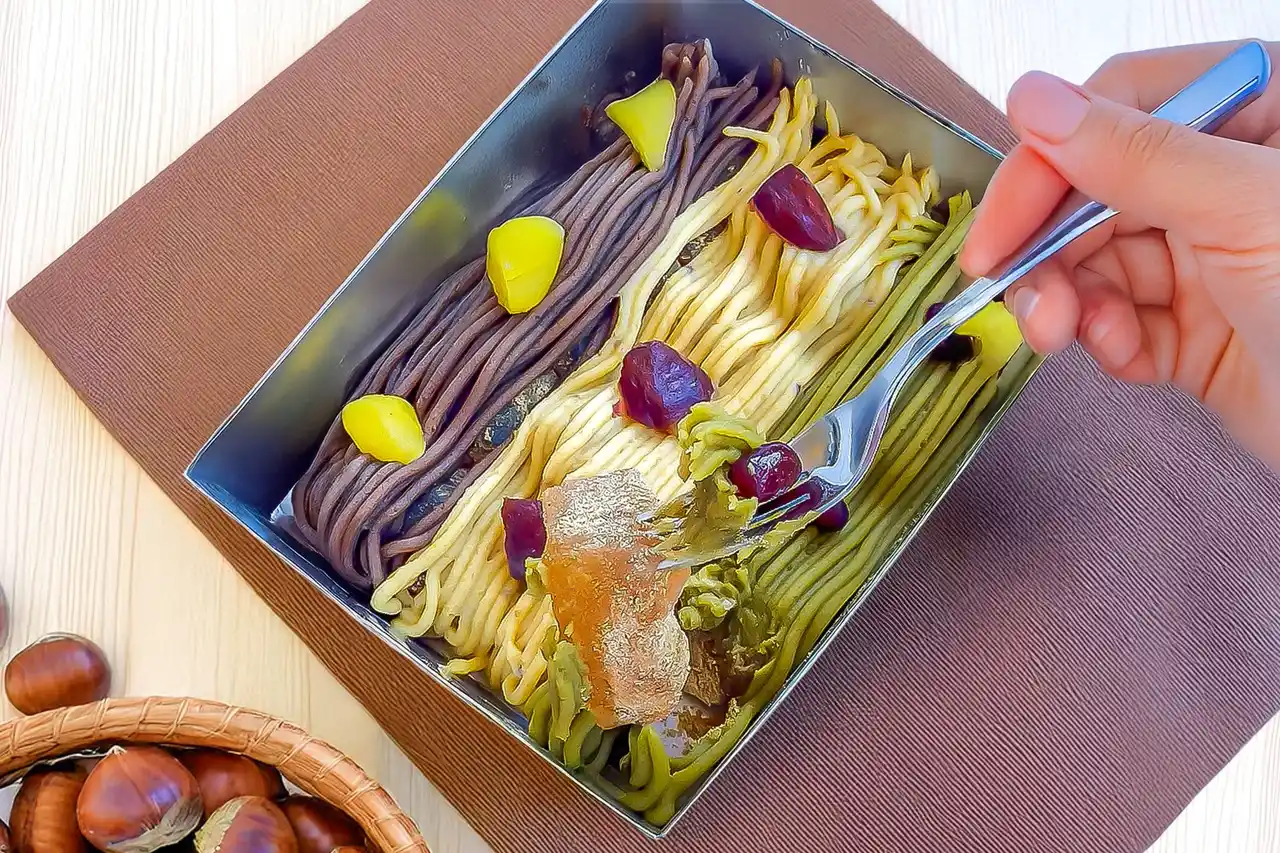 その上に、抹茶餡・栗餡・ほうじ茶餡を、モンブラン仕立てで贅沢に重ね、それぞれの餡に合わせた栗と小豆をトッピングした贅沢仕様。ひと匙で三度おいしい「和の宝石箱」のようなスイーツです。 |