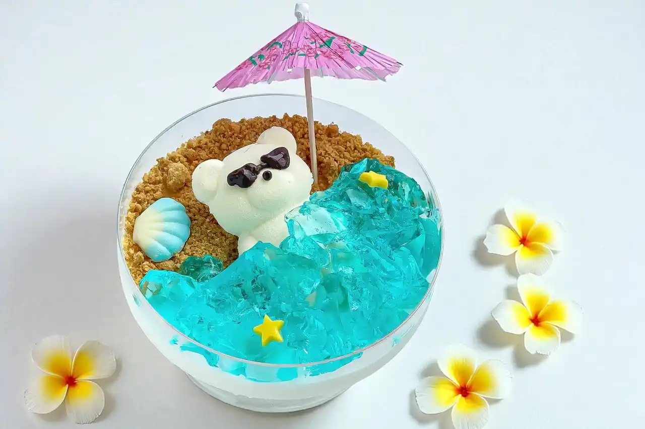 カップの底には、ぷるぷる食感が楽しい特製の杏仁豆腐。海をイメージした爽やかなブルーハワイ味のゼリーに、まるでプカプカと浮かんでいるようなクマさんは、濃厚だけどさっぱりとしたレアチーズ仕立て。寝そべっている砂浜はサクサク食感のクッキー生地。貝殻やお星さまのデコレーションはホワイトチョコでできています。 |