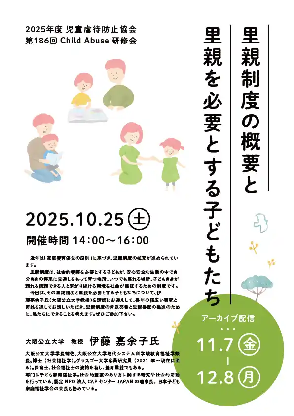 | 今回は、その里親制度と里親を必要とする子どもたちについて、伊藤嘉余子氏(大阪公立大学教授)を講師にお迎えして、長年の幅広い研究と実践を通してお話しいただき、里親制度の普及啓発と里親委託の推進のために、私たちにできることを考えます。ぜひご参加下さい。 | |||||