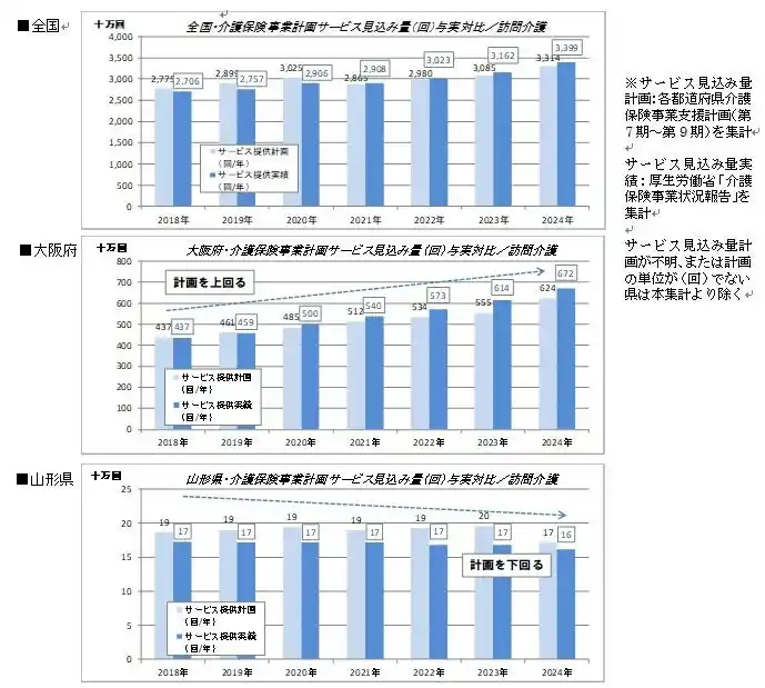 全国集計では第7期は計画が実績を上回ったものの8期以降は実績が計画を上回り推移している。訪問介護は2021年以降の事業所数がそれまで横ばいで推移していたものが増加に転じており、その影響が反映されたと考えられる。ただし全国での集計(単位は回/年)はサービス見込み総量の多い大阪府や東京都、愛知県等の大都市を含む都府県の影響が大きいことを考慮する必要がある。 |