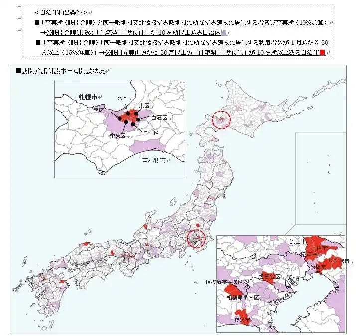 訪問介護サービスの同一建物減算対象ホームは都市部に集中。併設型ホーム(50戸以上)は札幌市が全国最多。介護報酬に依存した併設型ホームは財政負担も大きい。報酬体系の検討も必要。 |