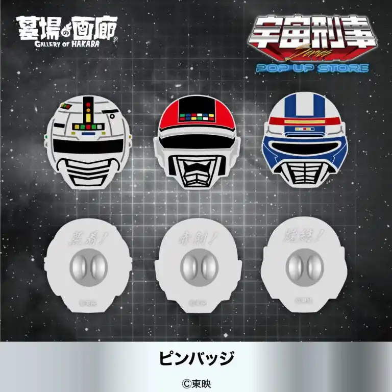 宇宙刑事ギャバン、シャリバン、シャイダーの3人の顔が、立体的なピンバッジになって登場!好みの一人に絞るもよし、3人揃えるもよし。つければ一際目立つワンポイントに。 |