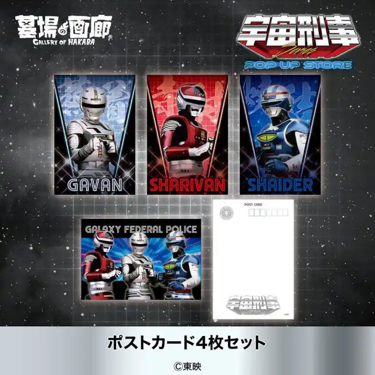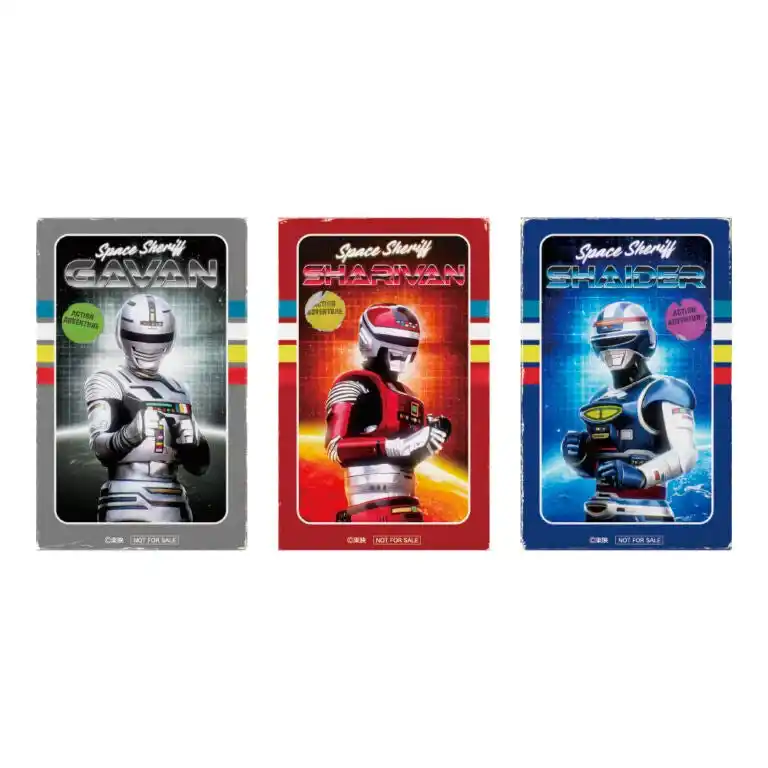 宇宙刑事ギャバン、シャリバン、シャイダーの3人が勢揃い!それぞれ単独のポストカードに加え、3人が揃ったポストカードには思わず胸が熱くなる!気軽に手に取れるお土産として、コレクションはもちろん、フレームに入れれば立派なインテリアにもなる使い勝手のいいアイテムだ。 |