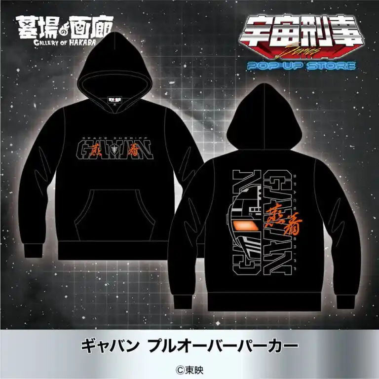 宇宙刑事ギャバンのプルオーバーパーカー登場!ブラックボディに映えるシンプルながら迫力ある、SF感満載のラインアートデザイン。背中には目が光るギャバンと印象的な蒸着の文字。肌寒い季節にピッタリな、着るだけで胸のエンジンに火が付くパーカーだ。 |