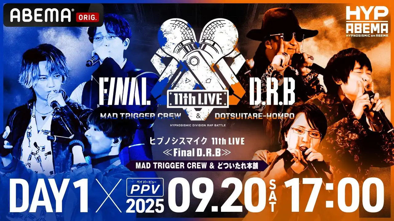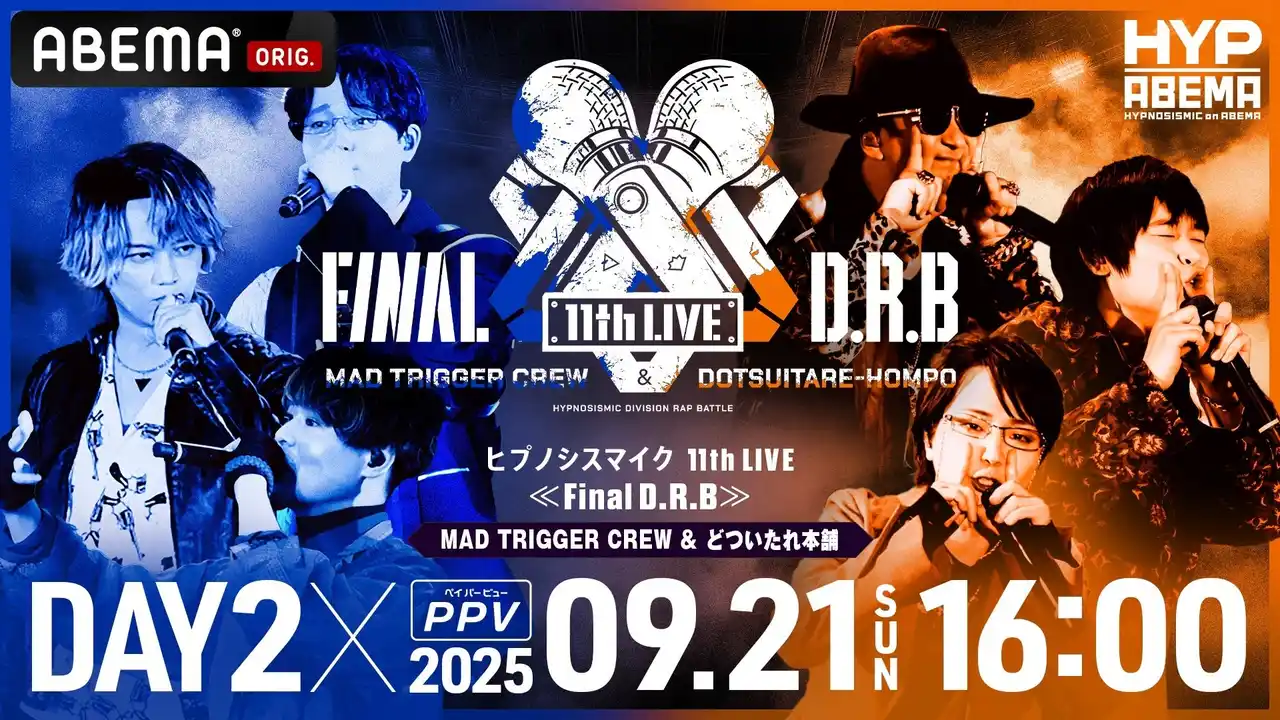 新しい未来のテレビ「ABEMA」は、2025年9月と10月に開催される大人気“音楽原作キャラクターラッププロジェクト”『ヒプノシスマイク -Division Rap Battle-』(以下『ヒプノシスマイク』)の11th ライブ『ヒプノシスマイク -Division Rap Battle- 11th LIVE≪Final D.R.B≫』全6公演を、「ABEMA PPV(アベマ ペイパービュー)」にて、独占生放送いたします。また本公演のPPVチケット販売を8月8日(金)12時より開始いたします。 |