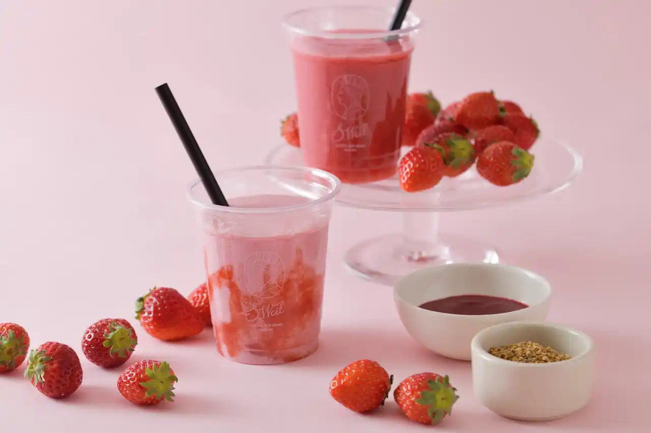 完熟いちごと赤桃のフラッペ(右)/完熟いちごと赤桃とエルダーフラワーのミルクフラッペ(左) |