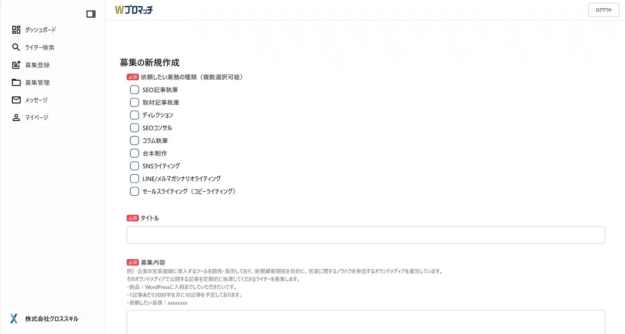 ※スカウトの場合:サイドバーの「ライター検索」→採用したいWeb人材にメッセージ送信 |